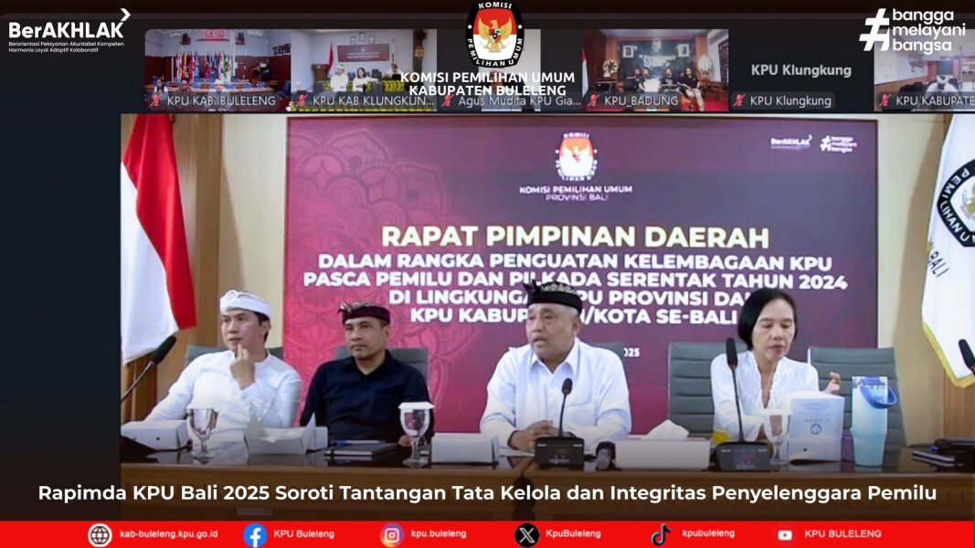Singaraja, kab-buleleng.kpu.go.id — KPU Kabupaten Buleleng memandang Rapat Pimpinan Daerah (Rapimda) KPU Provinsi Bali Tahun 2025 sebagai momentum strategis untuk memperkuat tata kelola dan integritas kelembagaan penyelenggara pemilu pasca Pemilu dan Pilkada Serentak 2024. Kegiatan ini dilaksanakan pada Jumat (19/12/2025) secara luring yang bertempat di Ruang Rapat Lantai II KPU Provinsi Bali dan secara daring melalui zoom meeting, dengan dihadiri pimpinan KPU Provinsi Bali serta KPU Kabupaten/Kota se-Bali. Rapimda menitikberatkan evaluasi menyeluruh terhadap pengelolaan keuangan, administrasi, serta etika penyelenggara sebagai bagian dari upaya pembenahan internal kelembagaan. Ketua KPU Provinsi Bali menegaskan bahwa integritas, kehati-hatian, dan kepatuhan terhadap regulasi harus menjadi fondasi utama dalam setiap pelaksanaan tugas penyelenggara pemilu. Dalam rangka memperkuat tata kelola dan mitigasi risiko, Rapimda menghadirkan narasumber dari BPK Perwakilan Provinsi Bali dan Polda Bali. BPK Perwakilan Bali memaparkan materi terkait mitigasi risiko pengelolaan anggaran, khususnya pada tahap pelaksanaan dan pertanggungjawaban keuangan, serta pentingnya penguatan sistem pengendalian internal guna mencegah terjadinya penyimpangan. Sementara itu, Polda Bali menyampaikan paparan mengenai sinergi pengamanan dalam penyelenggaraan Pemilu dan Pilkada, dengan menekankan pendekatan preemtif, preventif, dan humanis sebagai upaya menjaga stabilitas dan keamanan tahapan demokrasi. Setelah rangkaian evaluasi dan penguatan kapasitas kelembagaan tersebut, Rapimda juga diisi dengan penyerahan penghargaan kepada KPU Kabupaten/Kota yang dinilai memiliki kinerja terbaik sepanjang tahun 2025. Dalam kesempatan tersebut, KPU Kabupaten Buleleng berhasil meraih tiga penghargaan, yakni Kajian Teknis Terbaik I Pemilu/Pemilihan Serentak 2024 Verifikasi Partai Politik Calon Peserta Pemilu, Terbaik I dalam Pengelolaan JDIH Tahun 2025, serta Terbaik III Sosialisasi dan Pendidikan Pemilih Terbaik KPU Kabupaten/Kota se-Bali. Bagi KPU Kabupaten Buleleng, capaian tersebut tidak hanya dimaknai sebagai prestasi, tetapi juga sebagai pengingat akan tanggung jawab besar untuk terus memperbaiki tata kelola, memperkuat integritas, dan meningkatkan kualitas pelayanan publik. Melalui Rapimda KPU Bali 2025, KPU Kabupaten Buleleng menegaskan komitmennya untuk terus berbenah dan menghadirkan penyelenggaraan pemilu yang semakin kredibel, transparan, dan dipercaya masyarakat. (Parhumas / KPU Buleleng) ....