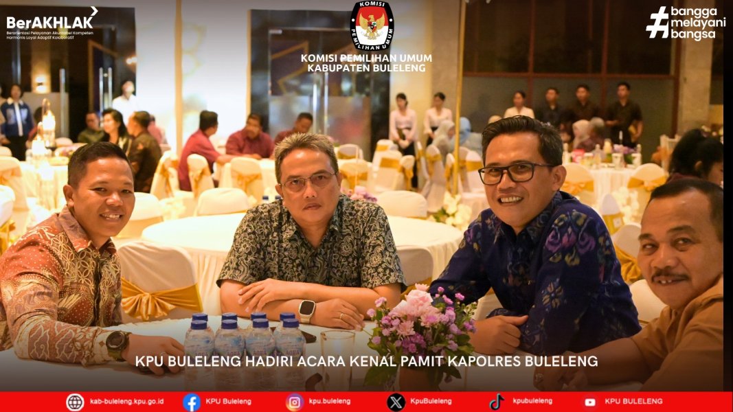 Singaraja, kab-buleleng.kpu.go.id – Komisi Pemilihan Umum (KPU) Kabupaten Buleleng menghadiri acara kenal pamit Kepala Kepolisian Resor (Kapolres) Buleleng yang diselenggarakan pada Kamis, 8 Januari 2026, bertempat di Hotel Villandra Singaraja. Kegiatan ini menjadi bagian dari rangkaian pergantian kepemimpinan di lingkungan Polres Buleleng. Kehadiran KPU Kabupaten Buleleng dalam acara tersebut diwakili langsung oleh Ketua KPU Kabupaten Buleleng, Komang Dudhi Udiyana. Acara kenal pamit ini menandai peralihan jabatan Kapolres Buleleng dari AKBP Ida Bagus Widwan Sutadi, S.I.K., M.H. kepada pejabat baru, AKBP Ruzi Gusman, S.I.K., M.Si., M.T., M.Sc. Acara berlangsung dengan khidmat dan penuh keakraban, serta dihadiri oleh unsur Forum Koordinasi Pimpinan Daerah (Forkopimda), pimpinan instansi vertikal, tokoh masyarakat, tokoh adat, serta berbagai pemangku kepentingan di Kabupaten Buleleng. Momentum kenal pamit ini dimanfaatkan sebagai ajang silaturahmi sekaligus penguatan sinergi lintas sektor dalam menjaga stabilitas keamanan dan ketertiban daerah. Dalam kesempatan tersebut, Ketua KPU Kabupaten Buleleng, Komang Dudhi Udiyana, menyampaikan apresiasi dan terima kasih atas dedikasi serta pengabdian AKBP Ida Bagus Widwan Sutadi selama menjabat sebagai Kapolres Buleleng. Ia menilai kepemimpinan AKBP Ida Bagus Widwan Sutadi telah memberikan kontribusi positif dalam menjaga kondusivitas wilayah, termasuk dalam mendukung kelancaran tahapan penyelenggaraan pemilu dan pemilihan. Selain itu, Ketua KPU Kabupaten Buleleng juga menyampaikan ucapan selamat datang dan selamat bertugas kepada AKBP Ruzi Gusman sebagai Kapolres Buleleng yang baru. Ia berharap kepemimpinan AKBP Ruzi Gusman dapat terus memperkuat sinergi antara Polres Buleleng dan KPU Kabupaten Buleleng, khususnya dalam menjaga stabilitas keamanan, ketertiban, serta mendukung penyelenggaraan demokrasi yang berintegritas. Melalui kehadiran dalam kegiatan kenal pamit ini, KPU Kabupaten Buleleng menegaskan komitmennya untuk terus menjalin koordinasi dan kerja sama yang harmonis dengan Polres Buleleng dan seluruh pemangku kepentingan. Sinergi yang solid antar lembaga diharapkan mampu menciptakan situasi daerah yang aman, kondusif, dan mendukung kelancaran pelaksanaan tugas-tugas pemerintahan serta penyelenggaraan pemilu di Kabupaten Buleleng. (Parhumas/ KPU Buleleng) ....