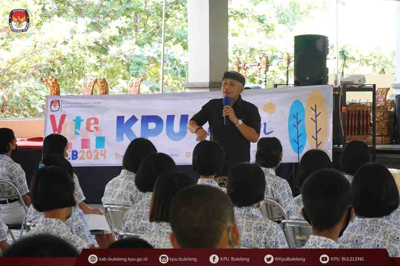 Anggota KPU Buleleng Divisi Sosialisasi, Pendidikan Pemilih, Partisipasi Masyarakat dan SDM Gede Bandem Samudra pada kesempatan tersebut didampingi oleh dua Narasumber masing-masing dari Akademisi Universitas Mahasaraswati Denpasar, Lanang Perbawa dan Anggota Bawaslu Kabupaten Buleleng Tri Prasetya.