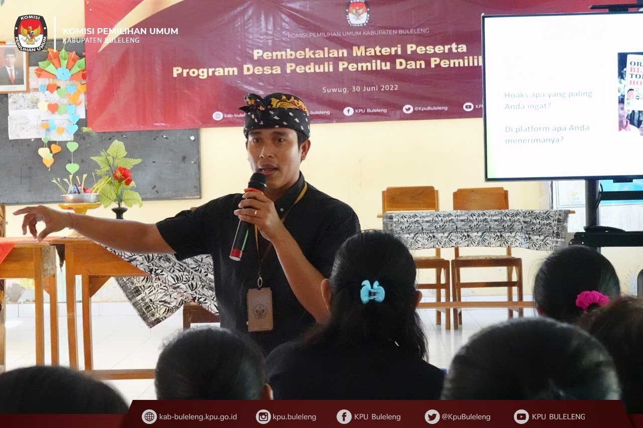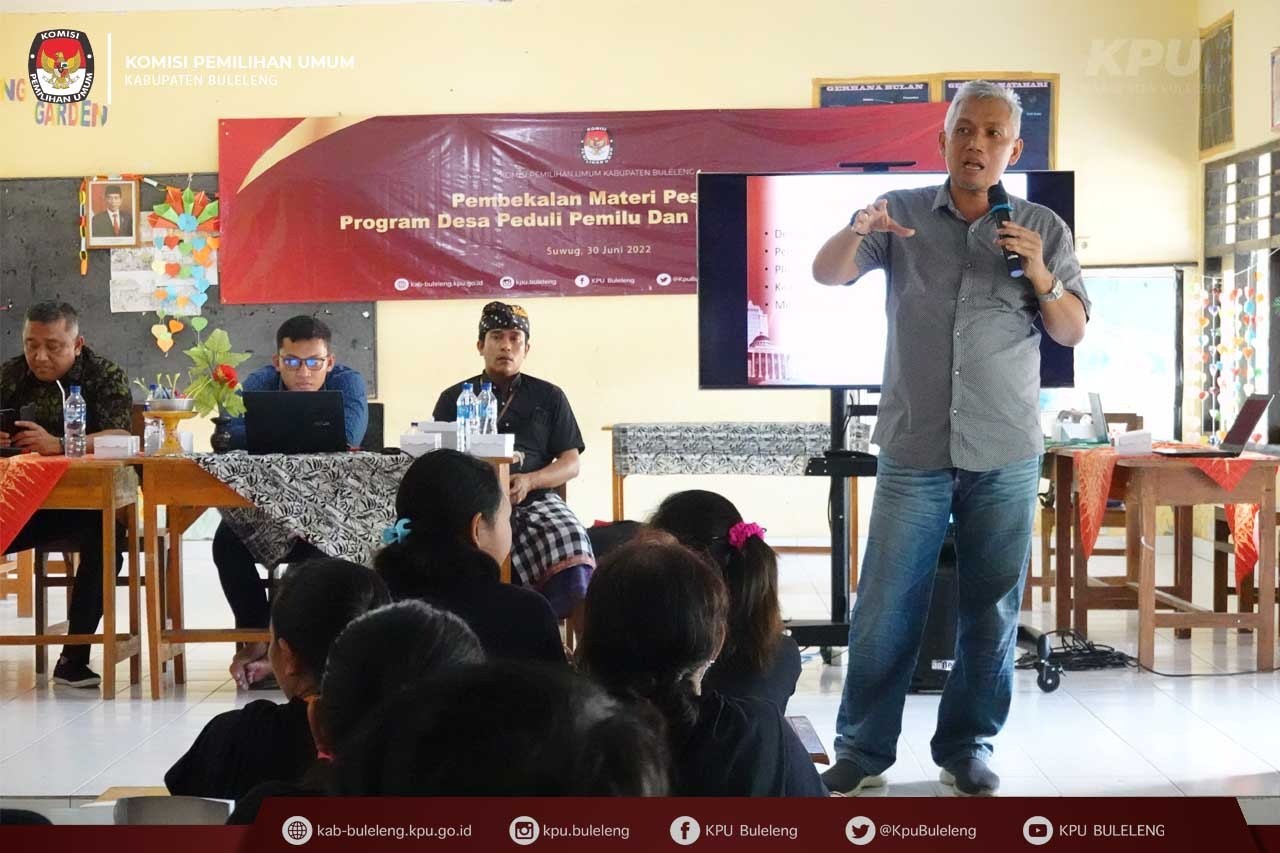 Singaraja, kab-buleleng.kpu.go.id – Dalam rangka membangun kesadaran politik sekaligus mengedukasi masyarakat akan pentingnya pemilu dan pemilihan, maka Komisi Pemilihan Umum (KPU) Kabupaten Buleleng melaksanakan program Desa Peduli Pemilu dan Pemilihan di Desa Suwug, Kecamatan Sawan Kabupaten Buleleng, Kamis (30/6/2022).