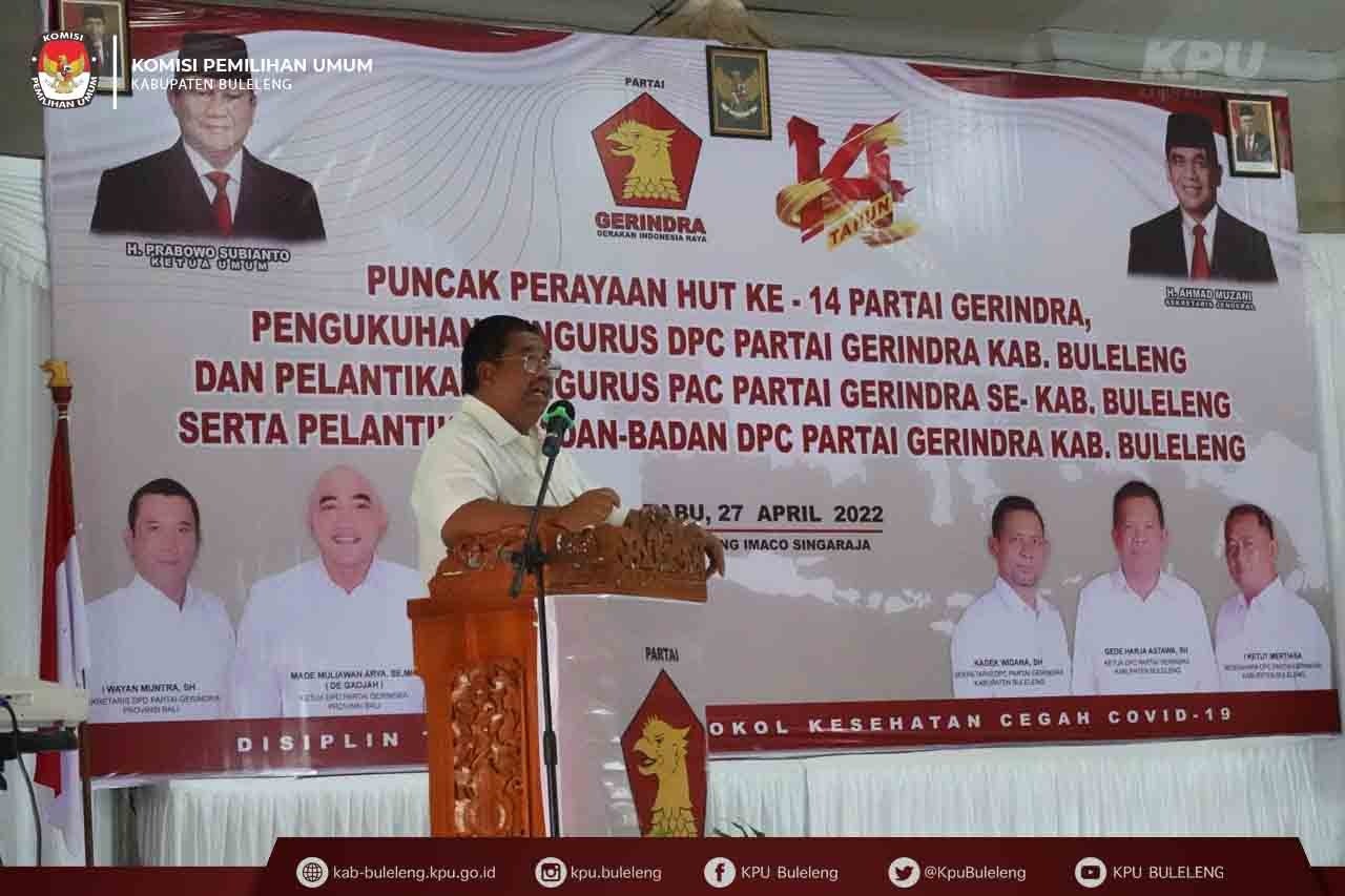 Singaraja, kab-buleleng.kpu.go.id - Ketua Komisi Pemilihan Umum (KPU) Kabupaten Buleleng Komang Dudhi Udiyana menghadiri undangan perayaan Hari Ulang Tahun (HUT) Partai Gerindra yang ke-14 di Gedung Imaco - Pelabuhan Buleleng, Rabu (27/4/2022).