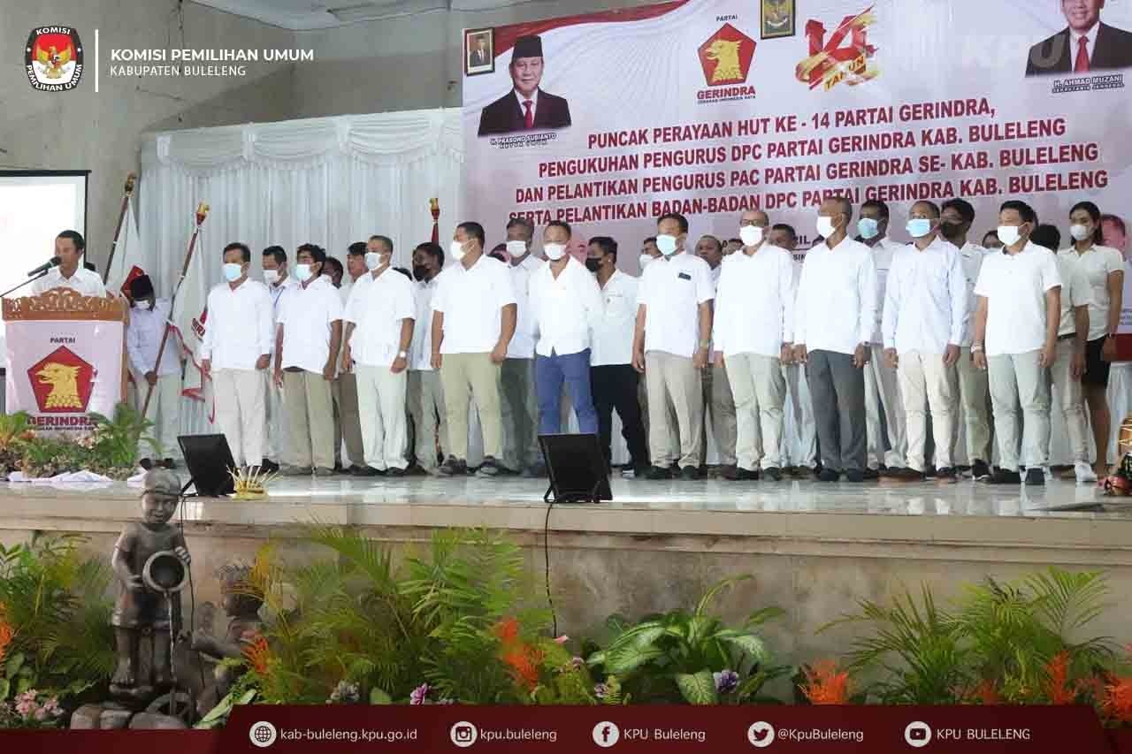 Acara yang ditandai dengan pemotongan tumpeng tersebut dirangkai dengan pelantikan Badan DPC Partai Gerindra Kabupaten Buleleng serta pengukuhan pengurus DPC dan PAC Partai Gerindra Kabupaten Buleleng. (ikke.red/Foto KPU Buleleng/sofyan/hupmas)