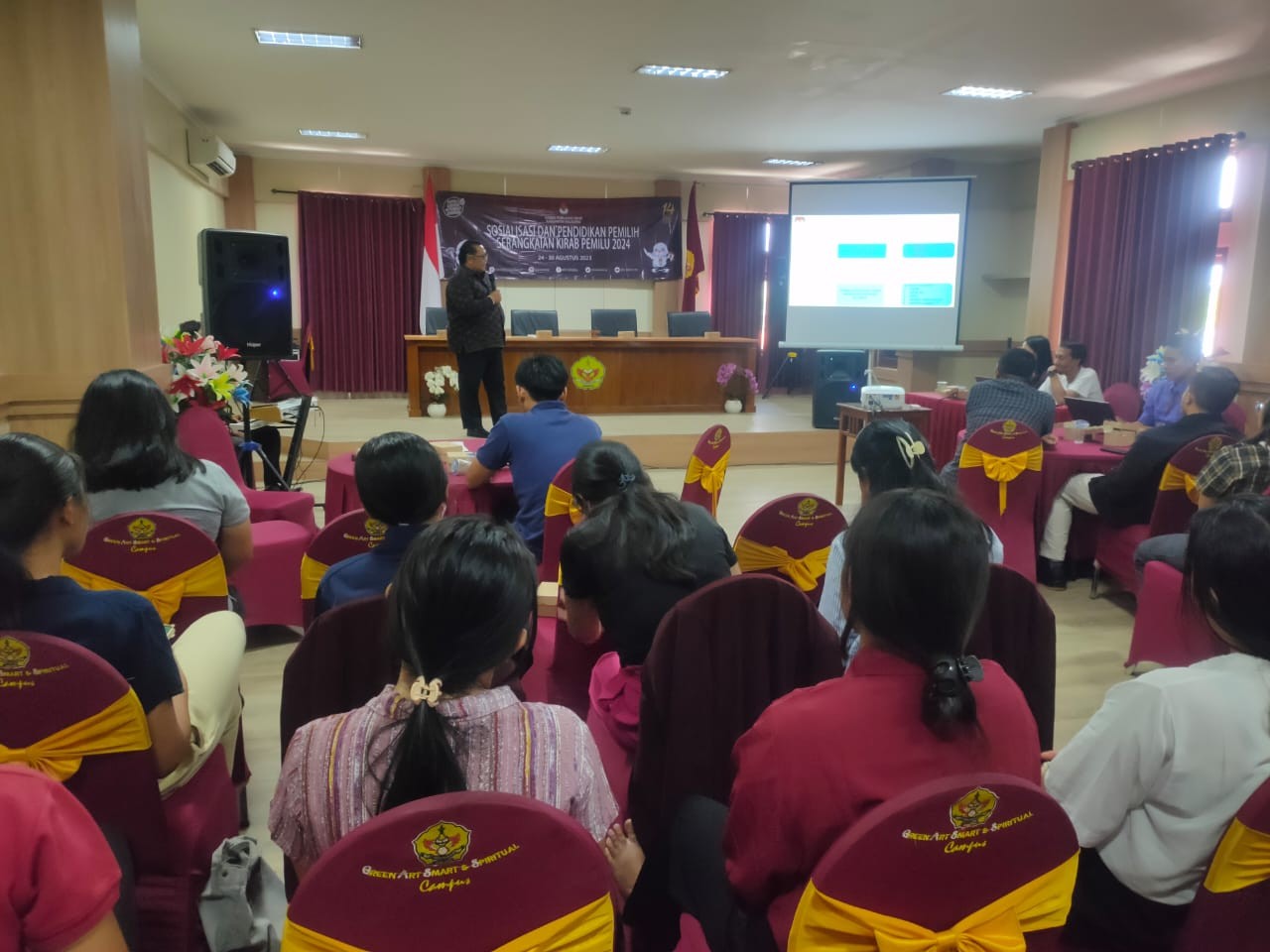 Kembali dari Patung Panji Landung, kirab dilanjutkan menuju kampus STAH Mpu Kuturan Singaraja di Kelurahan Banyuning Kecamatan Buleleng untuk melakukan sosialisasi pendidikan pemilih. Sebagai narasumber adalah Divisi Perencanaan Data dan Informasi KPU Kabupaten Buleleng, Nyoman Gede Cakra Budaya yang menyampaikan materi terkait pengertian dan pentingnya Pemilu, Peserta Pemilu 2024, ajakan untuk cek DPT Online, syarat-syarat pindah memilih serta Tahapan Pemilu 2024. Usai sosialisasi selama satu jam, iring-iringan kirab kembali ke Kantor KPU kabupaten Buleleng. (Ikke/Foto KPU Buleleng/Kobe/Hupmas)
