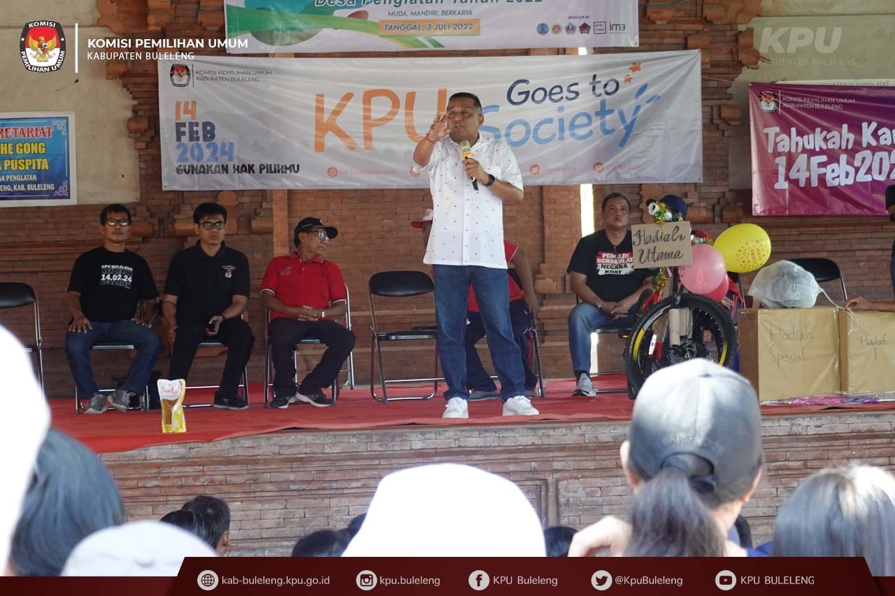 Singaraja, kab-buleleng.kpu.go.id – Pada pesta demokrasi Pemilihan Umum yang akan digelar pada 14 Februari 2024 mendatang, masyarakat dihimbau untuk menjadi pemilih yang cerdas dan berani dengan tegas menolak politik uang. Pemilu merupakan ajang untuk mengevaluasi pemimpin yang digelar setiap lima tahun sekali. “Maka jadilah pemilih cerdas dengan memilih calon pemimpin yang berkualitas dan mampu menyerap aspirasi masyarakat banyak,” Demikian disampaikan Ketua Komisi Pemilihan Umum (KPU) Provinsi Bali, I Dewa Agung Gede Lidartawan pada sosialisasi Tahapan Pemilu Tahun 2024 disela-sela kegiatan jalan santai yang dilaksanakan Karang Taruna Dharma Bakti Desa Pengelatan, Kecamatan Buleleng, Minggu (3/7/2022).