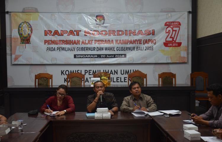 KPU Kabupaten Buleleng melaksanakan rapat koordinasi terkait pembersihan Bahan Kampanye dan Alat Peraga Kampanye (APK) yang dimulai pada tanggal 24-26 Juni 2018.