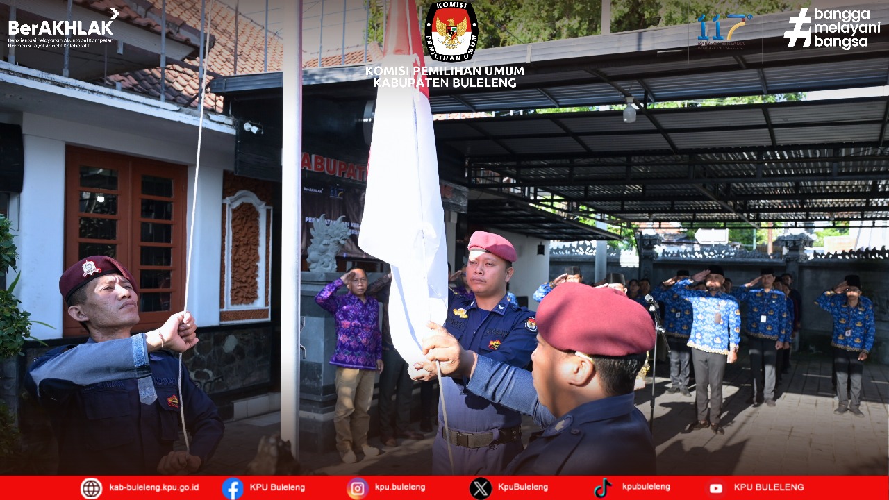 Upacara bendera dipimpin oleh Ketua KPU Buleleng Komang Dudhi Udiyana dengan peserta upacara Divisi Teknis Penyelenggaraan Gede Agus Tryo Arisnawan, Divisi Perencanaan Data dan Informasi Ngurah Cahyudi Wiratama, Divisi Sosialisasi Pendidikan Pemilih, Partisipasi Masyarakat dan SDM Putu Arya Suarnata, Divisi Hukum dan Pengawasan Ida Bagus Nyoman Dedy Andiwinata dan Sekretaris KPU Buleleng Ni Wayan Purnamawati beserta Ksb dan seluruh staf Sekretariat KPU Buleleng