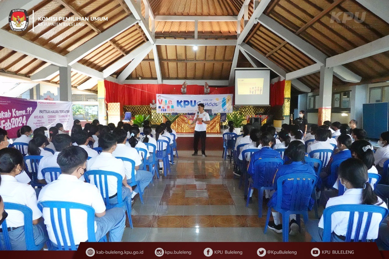 Singaraja, kab-buleleng.kpu.go.id – “Bersedia meluangkan waktu 5 (lima) menit untuk datang mencoblos ke Tempat Pemungutan Suara (TPS) akan mampu menentukan nasib bangsa selama lima tahun kedepan”. Demikian disampaikan Anggota KPU Kabupaten Buleleng Divisi Sosialisasi, Pendidikan Pemilih dan Partisipasi Masyarakat & SDM Gede Bandem Samudra pada saat memberikan sosialisasi pendidikan pemilih “KPU Goes to School” di SMA Negeri 1 Busungbiu, Selasa (24/5/2024).