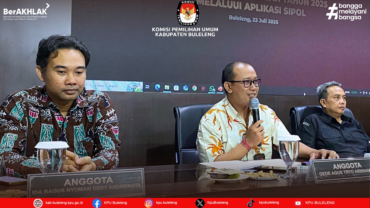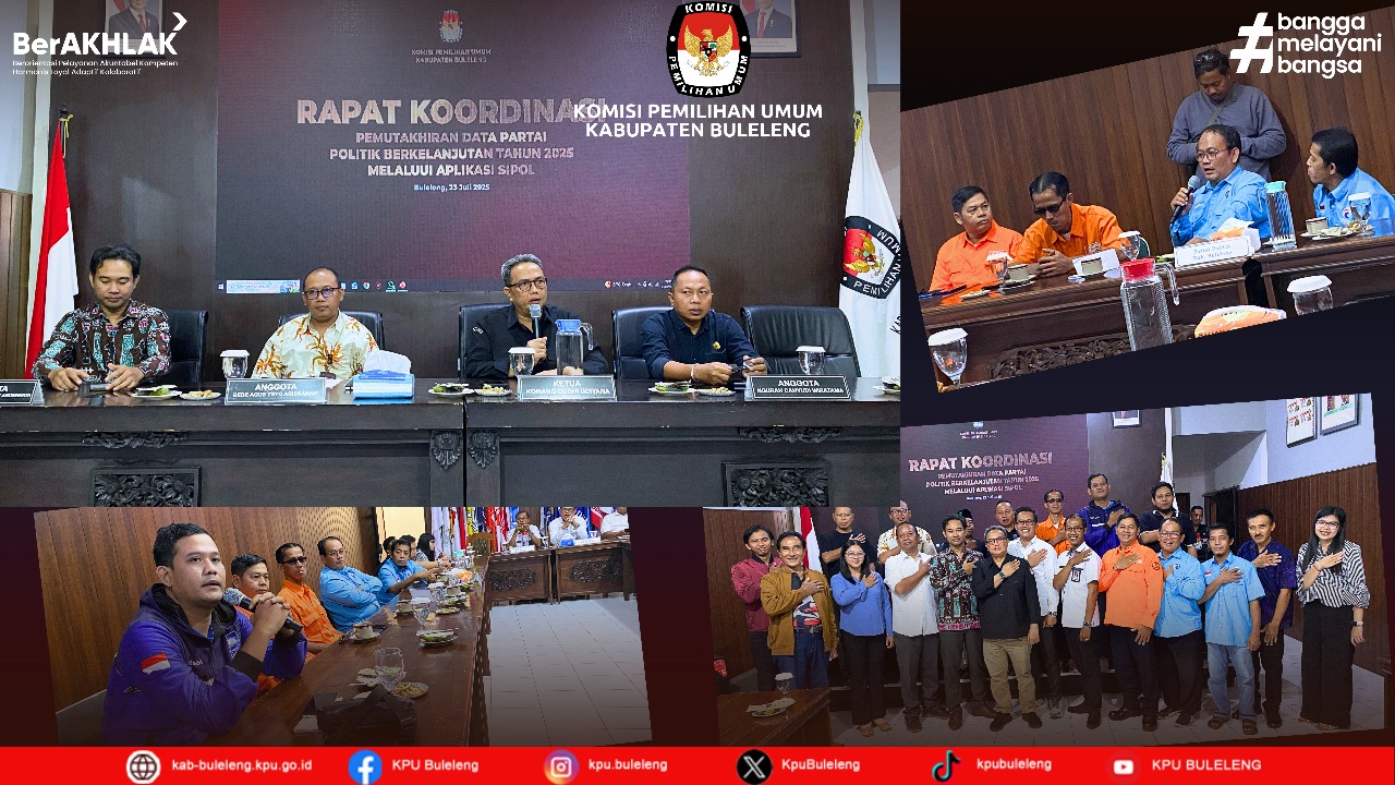 Singaraja, buleleng.kab.go.id - Komisi Pemilihan Umum (KPU) Kabupaten Buleleng menyelenggarakan Rapat Koordinasi Pemutakhiran Data Partai Politik Berkelanjutan Tahun 2025 melalui aplikasi SIPOL pada Rabu, 23 Juli 2025 di Ruang Rapat KPU Kabupaten Buleleng. Kegiatan ini dilaksanakan sebagai langkah awal menghadapi Pemilu 2029, dengan melibatkan partai politik peserta Pemilu 2024, Bawaslu Kabupaten Buleleng, serta Badan Kesatuan Bangsa dan Politik (Kesbangpol) Kabupaten Buleleng.