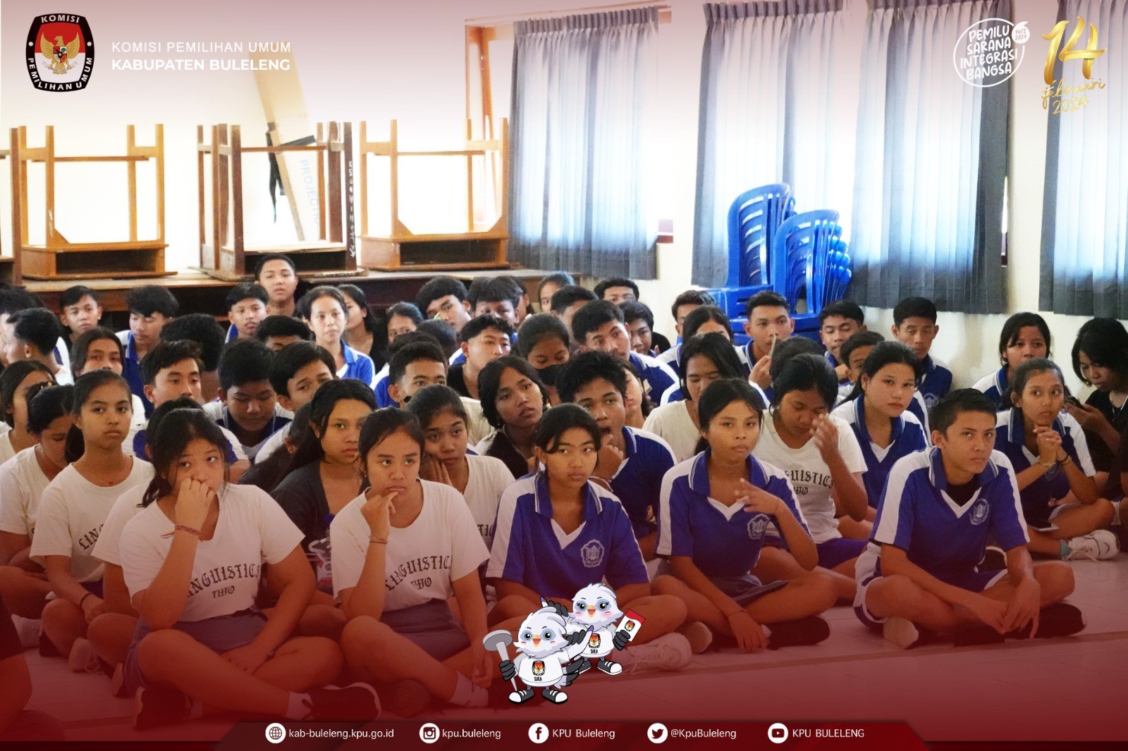 Anggota KPU Buleleng Divisi Sosialisasi Pendidikan Pemilih Partisipasi Masyarakat dan SDM Gede Bandem Samudra dalam penyampaian materi menjelaskan terkait tahapan-tahapan yang ada pada Pemilu 2024, yang memiliki persamaan dalam proses pemilihan Ketua Osis, Namun dalam pemilu harus memiliki syarat sebagai pemilih.