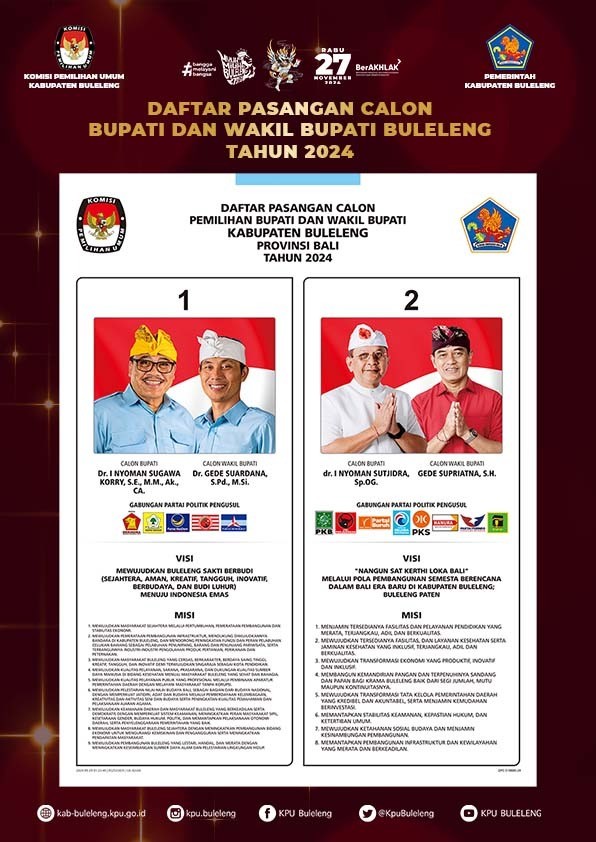 Berikut diumumkan Daftar Pasangan Calon Bupati dan Wakil Bupati Buleleng Tahun 2024.
