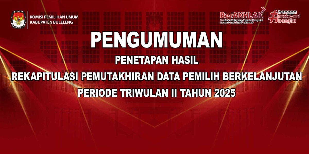 Berikut diumumkan Penetapan Hasil Rekapitulasi Pemutakhiran Data Pemilih Berkelanjutan Periode Triwulan II Tahun 2025 tingkat Kabupaten Buleleng.