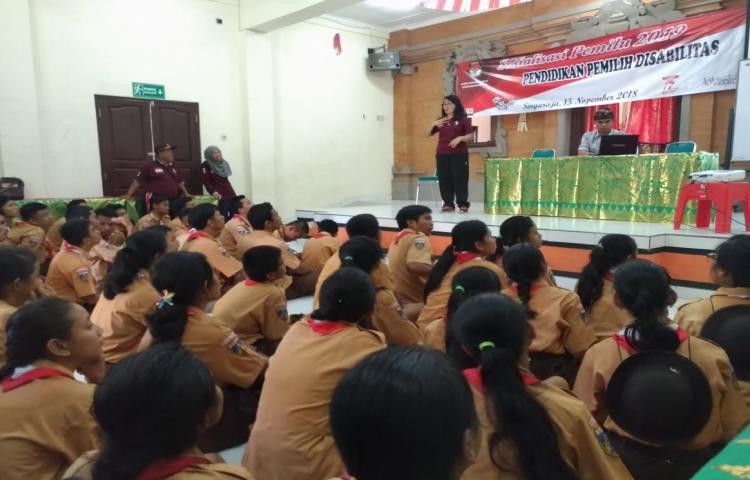 “Penyandang disabilitas seperti kalian juga memiliki hak untuk memilih pada Pemilu yang akan digelar pada tanggal 17 April 2019 mendatang,” kata Komisioner KPU Buleleng, Gede Bandem Samudra yang diikuti oleh seorang penerjemah tuna rungu pada acara sosilaisasi Pemilu 2019 (15/11/2019) di Aula SLB Negeri 1 Buleleng.
