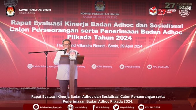 Singaraja, kab-buleleng.kpu.go.id - KPU Kabupaten Buleleng melaksanakan Rapat Evaluasi Kinerja Badan Adhoc dan Sosialisasi Calon Perseorangan Serta Penerimaan Badan Adhoc Pilkada 2024 di The Grand Villandra Resort Buleleng, Senin, (29/4/2024).