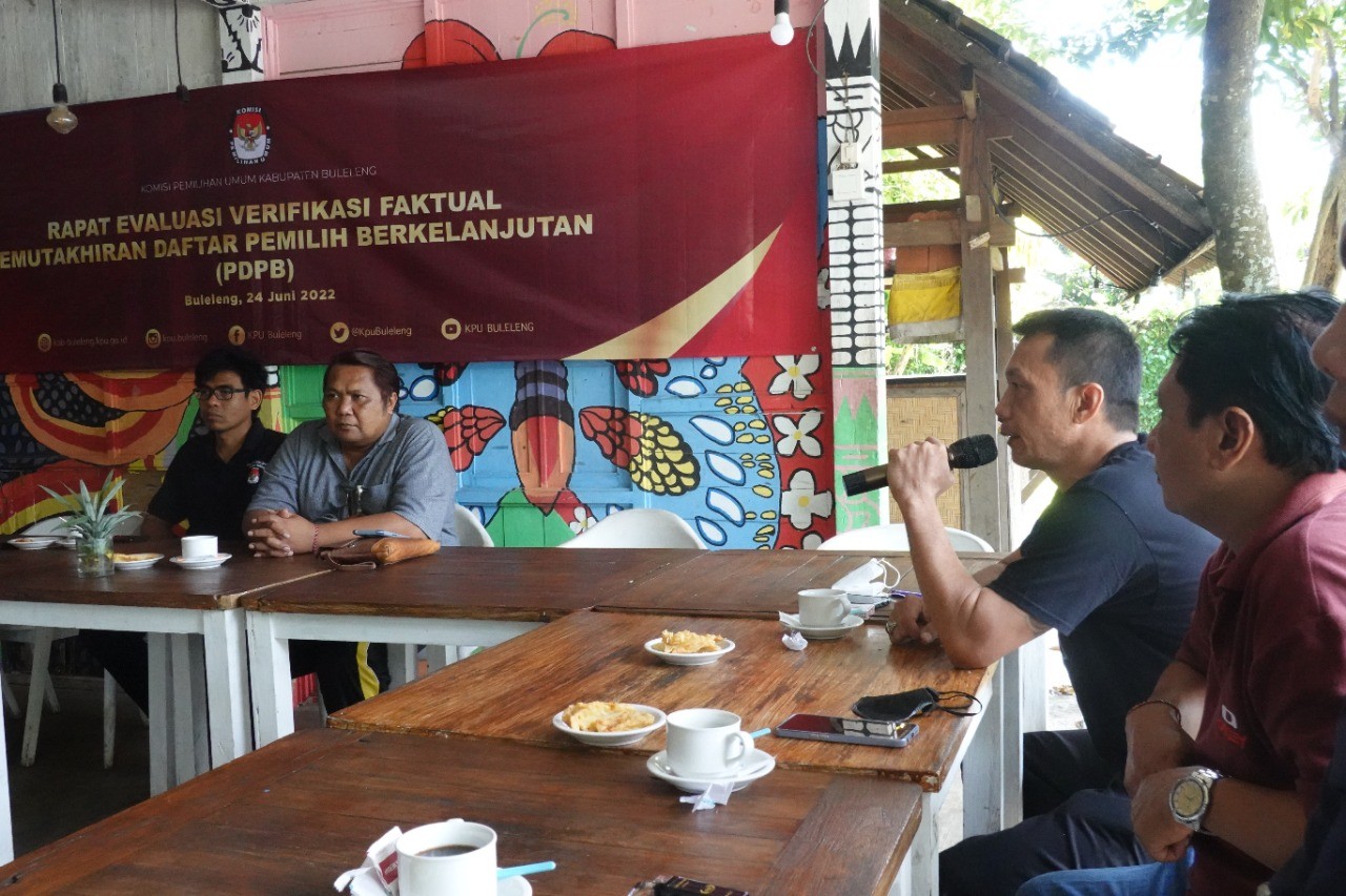 Singaraja, kab-buleleng.kpu.go.id – Komisi Pemlihan Umum (KPU) Kabupaten Buleleng melaksanakan rapat koordinasi evaluasi verifikasi faktual data pemilih berkelanjutan tahun 2022 di Alam Sambangan, Desa Sambangan Kecamatan Buleleng, Jumat (24/6/2022).