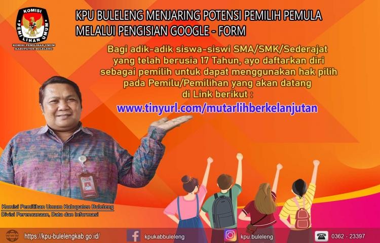 Melalui penyebaran link formulir pendaftaran pemilih http://tinyurl.com/mutarlihberkelanjutan ke SMA/SMK/Sederajat, KPU Buleleng serius data potensi pemilih pemula guna mendapatkan data siswa-siswi SMA/SMK/Sederajat yang telah berusia 17 tahun keatas pada tahun 2021.