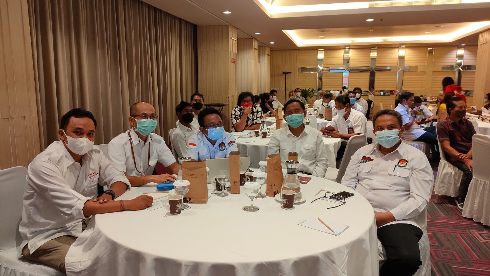 Ketua KPU Kabupaten Buleleng, Komang Dudhi Udiyana bersama Anggota Divisi Hukum dan Pengawasan, Made Sumertana menghadiri acara sosialisasi draft Peraturan KPU terkait verifikasi partai politik, Senin (29/11/2021) di Prime Plaza Hotel, Sanur.