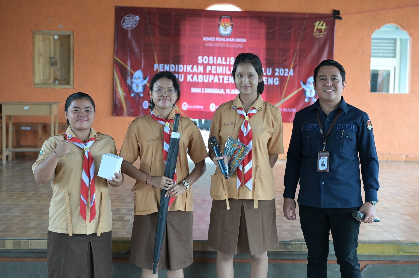 Singaraja, kab-buleleng.kpu.go.id – Komisi Pemilihan Umum (KPU) Kabupaten Buleleng melaksanakan sosialisasi pendidikan pemilih Pemilu 2024 menyasar segmen pemilih pemula di SMAN 2 Singaraja, Jumat (19/1/2024).