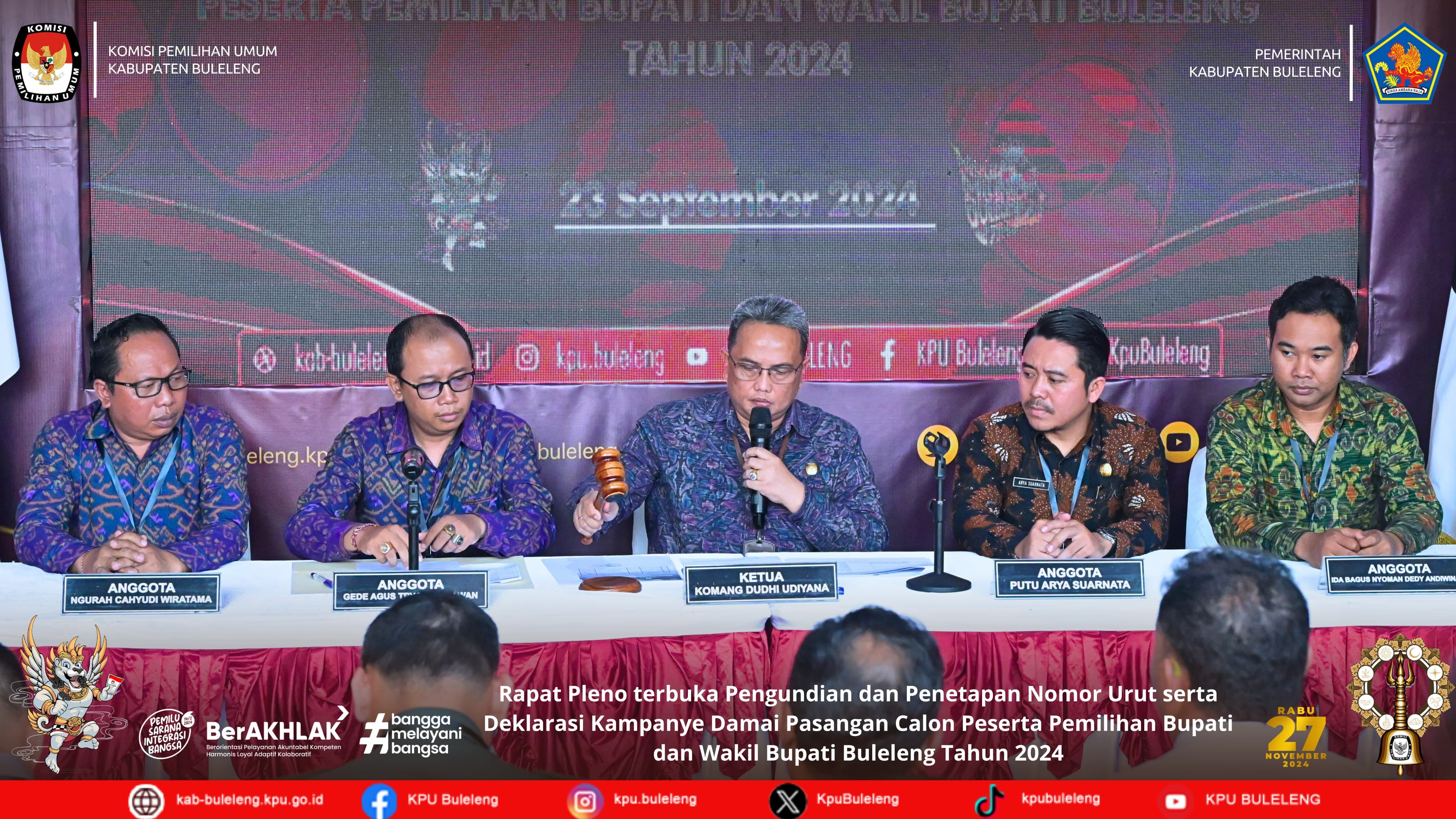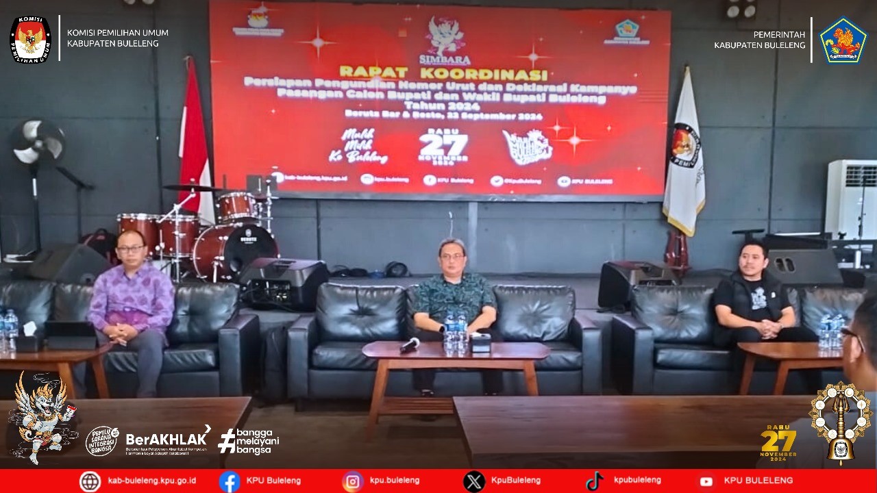 Singaraja.kab-buleleng.kpu.go.id – Memasuki tahapan kampanye Komisi Pemilihan Umum (KPU) Kabupaten Buleleng melaksanakan Rapat Koordinasi Pembahasan Pelaksanaan Kampanye bertempat di Kantor KPU kabupaten Buleleng, Senin, (23/9/2024). Hadir sebagai undangan kepolisian Resort Buleleng, Dandim 1609 Buleleng, Kepala Badan Kesbangpol Kabupaten Buleleng, Dinas Kominfosanti Kabupaten Buleleng, Kepala Satuan Pamong Praja Kabupaten Buleleng, Dinas Perhubungan, Dinas Lingkungan Hidup, Bappeda Kabupaten Buleleng, Ketua Bawaslu Kabupaten Buleleng dan L.O pasangan calon Dr. I Nyoman Sugawa Korry, SE., MM., Ak., CA - Dr. Gede Suardana S.Pd, M.Si dan L.O pasangan calon dr. I Nyoman Sutjidra Sp.OG - Gede Supriatna S.H. Dalam sambutannya Ketua KPU kabupaten Buleleng Komang Dudhi Udiyana menyampaikan bahwa setelah pelaksanaan pengundian dan penetapan nomor urut dimana pasangan calon sudah resmi memiliki nomor urut sesuai PKPU akan menjadi awal masa kampanye. Terkait hal ini diharapkan peran serta dan Kerjasama stakeholder dalam mendukung seluruh rangkaian kampanye agar berjalan aman dan tertib. Divisi Sosialisasi Pendidikan Pemilih, Partisipasi Masyarakat dan SDM Putu Arya Suarnata menyampaikan berkaitan dengan tahapan kampanye yang akan di mulai pada tanggal 25 September 2024 sampai dengan 23 Nopember 2024, secara aturan pasangan calon sudah bisa mendaftarkan jadwal kampanye, terkait dengan hal ini ditegaskan bahwa di awal jadwal kampanye ditiadakan karena bertepatan dengan Hari Raya Galungan, selanjutnya pelaksanaan kampanye akan mulai pada tanggal 26 September 2024. Untuk zona tatap muka dalam pembagian zona kampanye di uraikan menjadi dua bagian zona yaitu zona A Kecamatan Tejakula, Kubutambahan, Sawan, Buleleng, Sukasada dan masuk di zona B yaitu Kecamatan Banjar, Seririt, Busungbiu dan Gerokgak. Dijelaskan juga tentang titik pemasangan koordinat alat peraga untuk mempermudah pemasangan alat peraga kampanye agar strategis. Alat peraga kampanye yang difaslilitasi KPU ditetapkan sebanyak 18 dimana ditetapkan juga Kawasan steril larangan pemasangan APK seperti tempat ibadah. Diharapkan agar liasion officer dari kedua paslon bisa mengawasi pemasangan alat peraga agar berada pada tempat yang ditetapkan. Ketua Bawaslu kabupaten Buleleng I Kadek Carna Wirata menyampaikan bahwa pelaksanaan kampanye pada titik yang sudah diatur agar diperhatikan oleh pasangan calon dimana dua titik pemasangan APK milik perseorangan atau swasta agar dilengkapi dengan ijin terkait zona yang ditetapkan,mengantisipasi terjadinya konflik. “Terkait zona kampanye agar tidak berbenturan dengan paslon lain”, tegasnya. Untuk jadwal tahapan kampanye akan ditutup pada tanggal 23 Nopember 2024. (hupmas/ Kpu Buleleng)