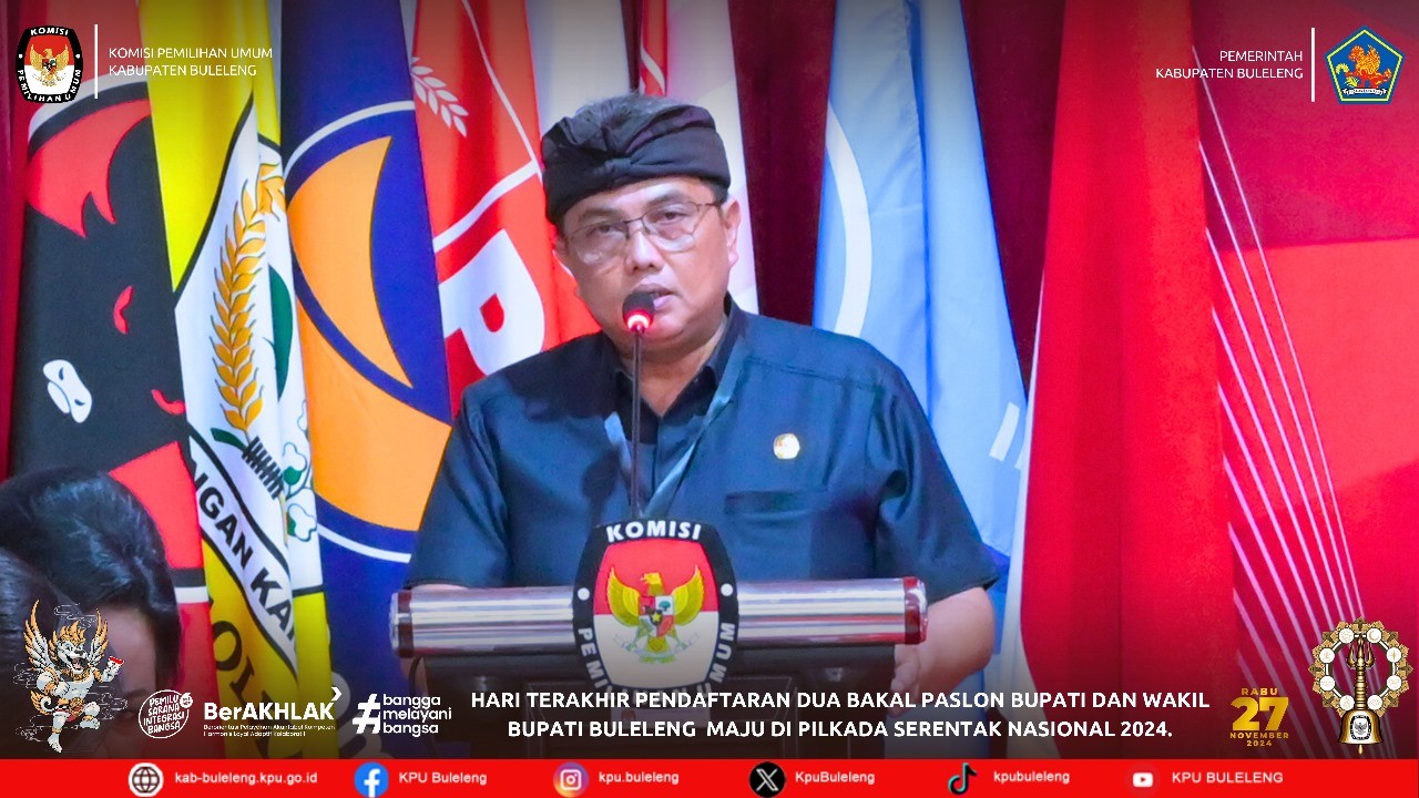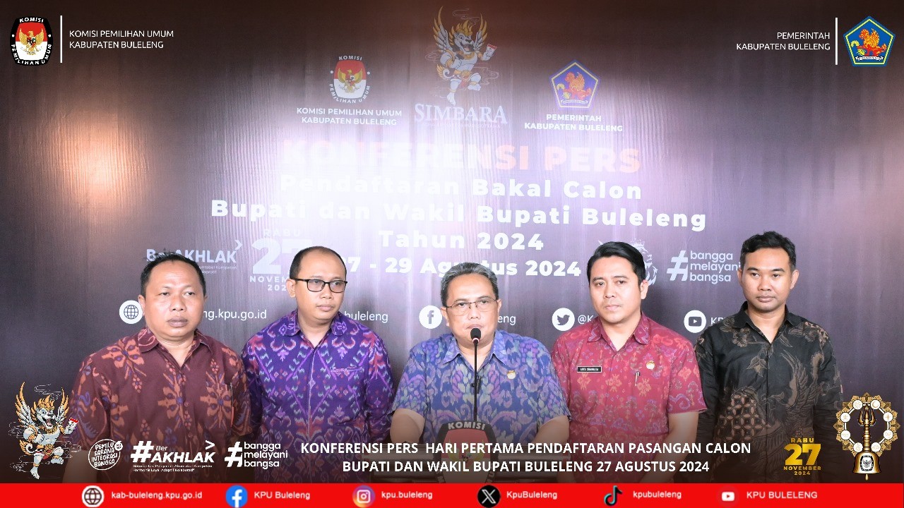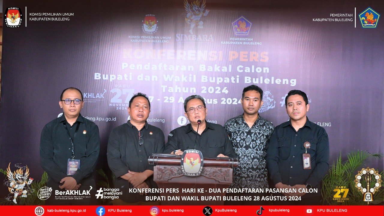 Singaraja,kab-buleleng.kpu.go.id – Memasuki hari kedua pendaftaran Ketua Komisi Pemilihan Umum (KPU) Kabupaten Buleleng Komang Dudhi Udiyana dalam konfrensi pers nya menyampaikan bahwa hari ini Rabu, 28 Agustus 2024 pendaftaran yang dibuka dari pukul 08.00 sampai dengan 16.00 wita belum ada bakal pasangan calon Bupati dan Wakil Bupati yang di daftarkan oleh partai politik maupun gabungan partai politik ke KPU Kabupaten Buleleng. Sementara sampai saat ini sudah ada terkonfirmasi dua pasangan calon yang akan mendaftar ke KPU Buleleng pada Kamis,(29/8/2024) pada pukul 09.00 Wita pasangan calon yang di usung partai PDI Perjuangan selanjutnya pada pukul 17.00 Wita akan mendaftar pasangan calon yang diusung oleh Partai Golkar. Diinformasikan juga bahwa persiapan pelaksanaan pendaftaran hari terakhir dari Polres Buleleng, Satpol PP dan Dinas Perhubungan akan menurunkan personil untuk bersiaga penuh di Kantor KPU Kabupaten Buleleng demi menjaga keamanan dan demi kelancaran tahapan pendaftaran bakal pasangan calon Bupati dan Wakil Bupati Buleleng 2024. Untuk diketahui, sesuai jadwal besok Kamis 29 Agustus 2024 yang merupakan hari terakhir pendaftaran akan dibuka hingga pukul 23.59 Wita. ( Hupmas/ Kpu Buleleng).