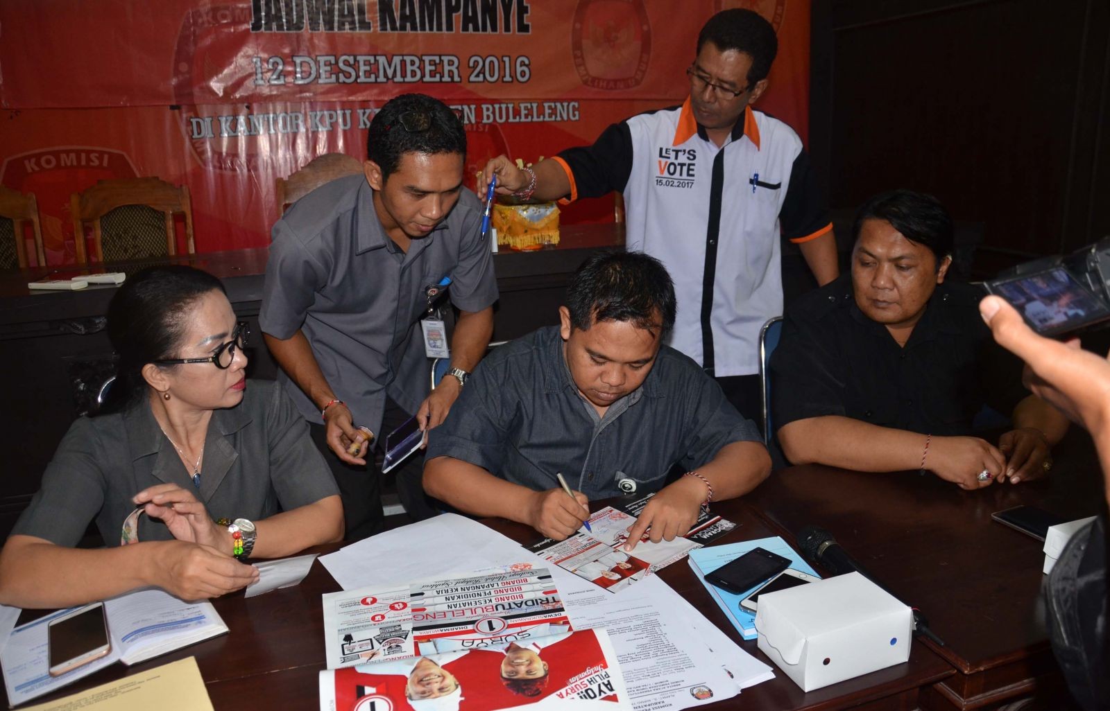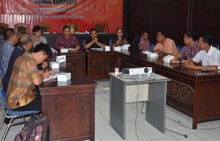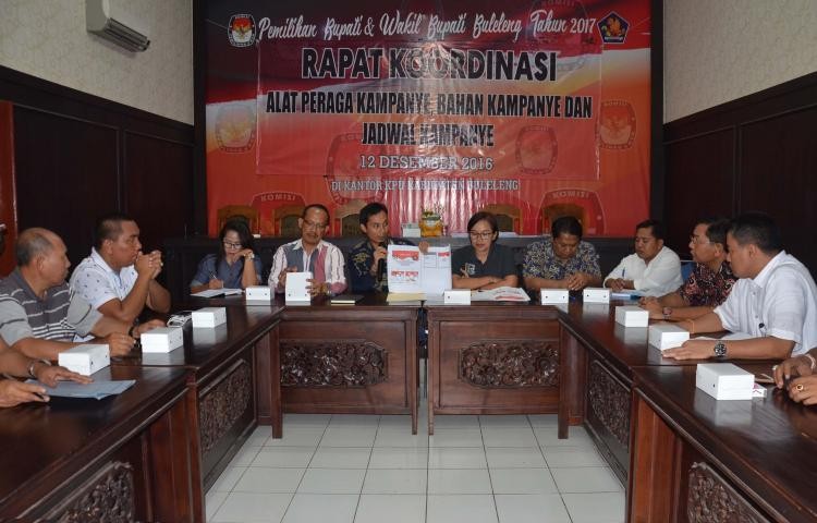 Proses pengadaan Bahan Kampanye dan Alat Peraga Kampanye (APK) mengharuskan penandatanganan (parafing) hasil cetak pertama (dummy), untuk menghindari ketidak sesuaian hasil cetak keseluruhan nantinya. “Dengan ditandatanganinya cetakan dummy ini, kita berarti sudah mendapatkan persetujuan dari kedua Tim Pasangan Calon untuk melakukan proses produksi secara menyeluruh terhadap Bahan Kampanye dan Alat Peraga Kampanye,” kata Anggota KPU Buleleng Divisi Sosialisasi dan SDM, Gede Sutrawan dihadapan Tim Kampanye Pasangan Calon dan disaksikan Ketua Panwaslih Kabupaten Buleleng, di Ruang Rapat Kantor KPU Kabupaten Buleleng, Senin (02/01/2017). Demi fasilitasi terhadap peserta dalam Pilkada Buleleng Tahun 2017, KPU Kabupaten Buleleng mengupayakan penyerahan Bahan Kampanye dan Pemasangan APK bertahap sejumlah yang telah diproduksi penyedia. “Kami akan berikan Bahan Kampanye dan APK secara bertahap, sehingga tidak harus menunggu hingga proses produksi keseluruhan berakhir agar tidak menghambat proses sosialisasi kedua Paslon,” jelas Gede Sutrawan. Penyedia mempunyai masa kerja sebagaimana kontrak pengadaan Bahan Kampanye dan APK selama 7 (tujuh) hari sejak penandatanganan Kontrak Pengadaan sampai dengan serah terima secara keseluruhan. (las)