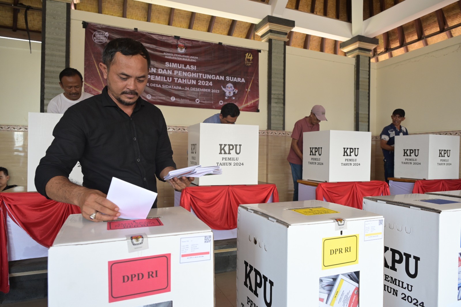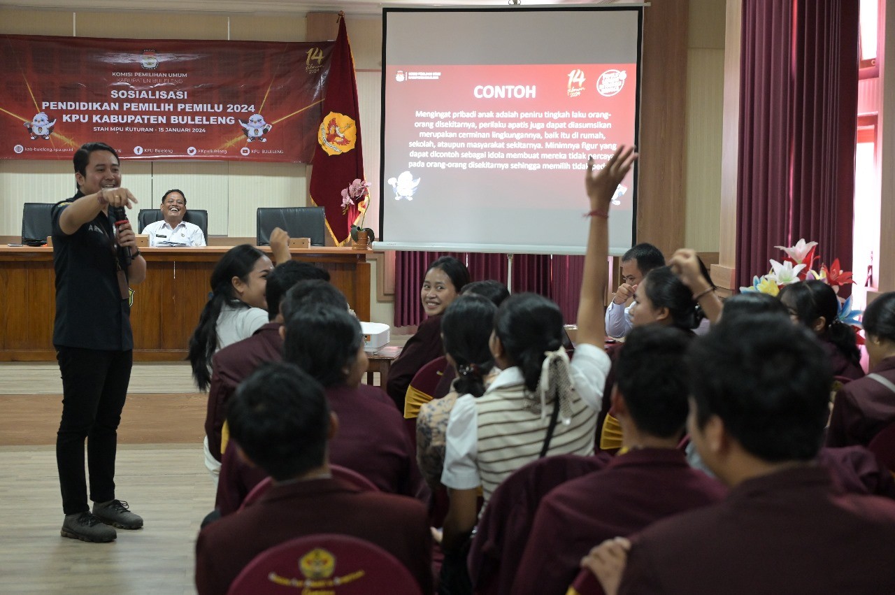 Singaraja, kab-buleleng.kpu.go.id – Untuk meningkatkan partisipasi pemilih pada Pemilu 2024, Komisi Pemilihan Umum (KPU) Kabupaten Buleleng mengencarkan kegiatan sosialisasi pendidikan pemilih kepada generasi muda dengan menyasar kampus dan SMA/SMK di Kabupaten Buleleng, salah satunya adalah di STAH Mpu Kuturan Singaraja, Senin (15/1/2024) Pada sosialisasi yang dilaksanakan di Ruang Aula Lantai 4 STAH Mpu Kuturan tersebut, Divisi Sosialisasi Pendidikan Pemilih Partisipasi Masyarakat dan SDM KPU Kabupaten Buleleng Putu Arya Suarnata menyampaikan informasi-informasi penting terkait Pemilu 2024, diantaranya tentang siapa peserta Pemilu 2024, jenis surat suara yang akan diterima, syarat-syarat sebagai pemilih, hari pemungutan suara pada Rabu, 14 Februari 2024 serta informasi-informasi lainnya. Arya Suarnata mengajak seluruh peserta sosialisasi yang telah memiliki hak pilih untuk datang ke TPS menggunakan hak pilih dengan sebaik-baiknya dan tidak golput. Karena partisipasi masyarakat sangatlah penting untuk masa depan Bangsa Indonesia. Jika tidak bisa berpatisipasi sebagai peserta pemilu, setidaknya bisa berpartisipasi sebagai pemilih yang cerdas, yang mampu memilih calon pemimpin berdasarkan visi, misi dan program serta rekam jejak calon. Disela-sela penyampaiannya, Arya Suarnata juga membagi-bagikan doorprize berupa baju kaos, mug dan payung kepada peserta yang aktif berpartisipasi dalam bertanya atau menjawab pertanyaan narasumber. Waka II Stah Mpu Kuturan Nyoman Miarta Putra menyambut baik kedatangan KPU Buleleng dalam mensosialisasikan Pemilu 2024 dan berharap agar peserta sosialisasi yang hadir dapat menggetoktularkan informasi kepemiluan yang didapatkan kepada lingkungan sekitar, mulai dari skup terkecil di lingkungan keluarga, komunitas hingga masyarakat luas. (Ikke/Hupmas/KPU Buleleng)