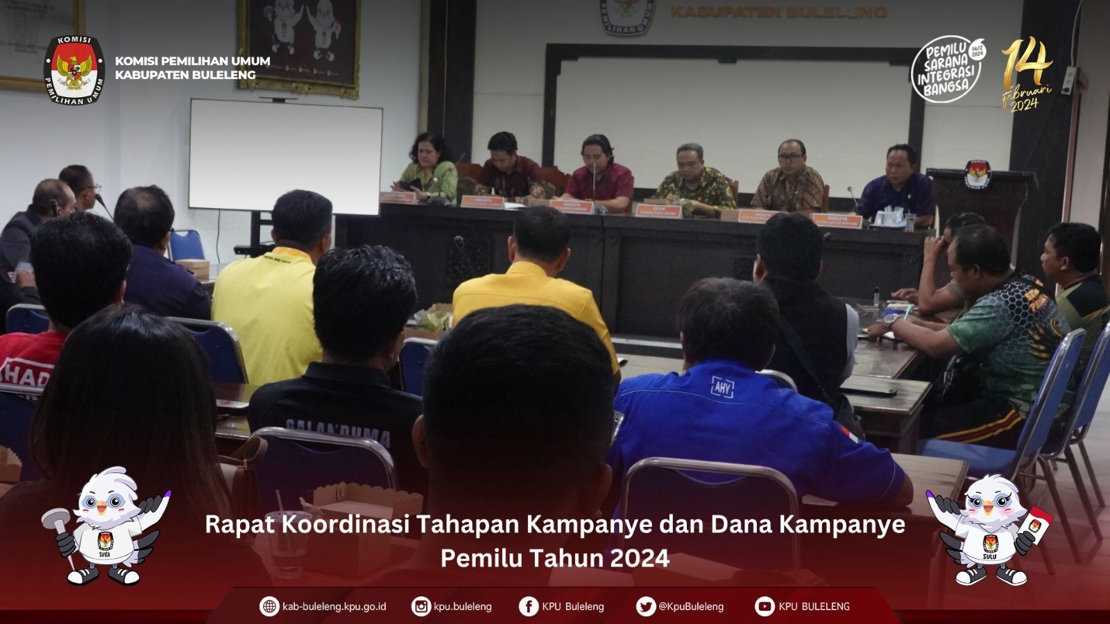 Singaraja, kab-buleleng.kpu.go.id – Komisi Pemilihan Umum (KPU) Kabupaten Buleleng melaksanakan Rapat Koordinasi Tahapan Kampanye dan Dana Kampanye Pemilu Tahun 2024, Jumat (24/11/2023) di Ruang Rapat Kantor KPU Kabupaten Buleleng. Pada rapat yang dibuka oleh Ketua KPU Kabupaten Buleleng Komang Dudhi tersebut, KPU Kabupaten Buleleng mengundang Kapolres Buleleng, Dandim 1609/Buleleng, Kepala Badan Kesbangpol Kab. Buleleng, Ketua Bawaslu Kab. Buleleng, Kepala Satpol PP Kab. Buleleng serta Ketua dan LO Partai Politik Peserta Pemilu Tahun 2024 di Kabupaten Buleleng. Pada rapat tersebut, Divisi Sosialisasi Pendidikan Pemilih dan Partisipasi Masyarakat KPU Kabupaten Buleleng Putu Arya Suarnata menyampaikan SK KPU Kabupaten Buleleng tentang Lokasi Pemasangan Alat Peraga Kampanye (APK) untuk Kampanye Pemilu Tahun 2024 di Wilayah Kabupaten Buleleng, dimana partai politik diijinkan untuk memasang APK di seluruh wilayah Kabupaten Buleleng kecuali pada lokasi yang dilarang. Lokasi yang dilarang yaitu di tempat ibadah, termasuk halaman pagar dan /atau tembok, rumah sakit atau tempat pelayanan kesehatan termasuk halaman, pagar, dan/atau tembok, tempat pendidikan, meliputi gedung dan/atau halaman sekolah dan/atau perguruan tinggi termasuk halaman, pagar dan/atau tembok, gedung milik pemerintah termasuk halaman, pagar dan/atau tembok, fasilitas umum dan fasilitas sosial tertentu milik pemerintah, rumah dinas termasuk halaman, pagar dan/atau tembok, museum termasuk halaman, pagar dan/atau tembok, monumen, cagar budaya, taman milik pemerintah, tempat pemakaman, jembatan, sungai, badan sungai dan salurannya, ambu lalu lintas, tiang penerangan jalan dan pohon, fasilitas lainnya yang dapat menggangu ketertiban umum. Larangan tersebut berlaku sejauh radius 100 meter dari batas terluar lokasi yang dilarang. Sementara pemasangan APK pada lahan pribadi/perorangan diperbolehkan sepanjang ada ijin tertulis dari pemilik lahan. Dalam hal Kampanye dan Dana Kampanye, KPU Kabupaten Buleleng akan menggunakan Aplikasi SIKADEKA. Masing-masing partai politik diwajibkan memiliki satu operator SIKADEKA yang akan mengelola akun parpol. Sementara pendaftaran petugas kampanye dan pelaksana kampanye oleh partai politik, sesuai Peraturan KPU No 15 Tahun 2023 tentang Kampaye Pemilihan Umum dijadwalkan paling lambat tanggal 25 November 2023. (Ikke/Foto KPU Buleleng/Hupmas)
