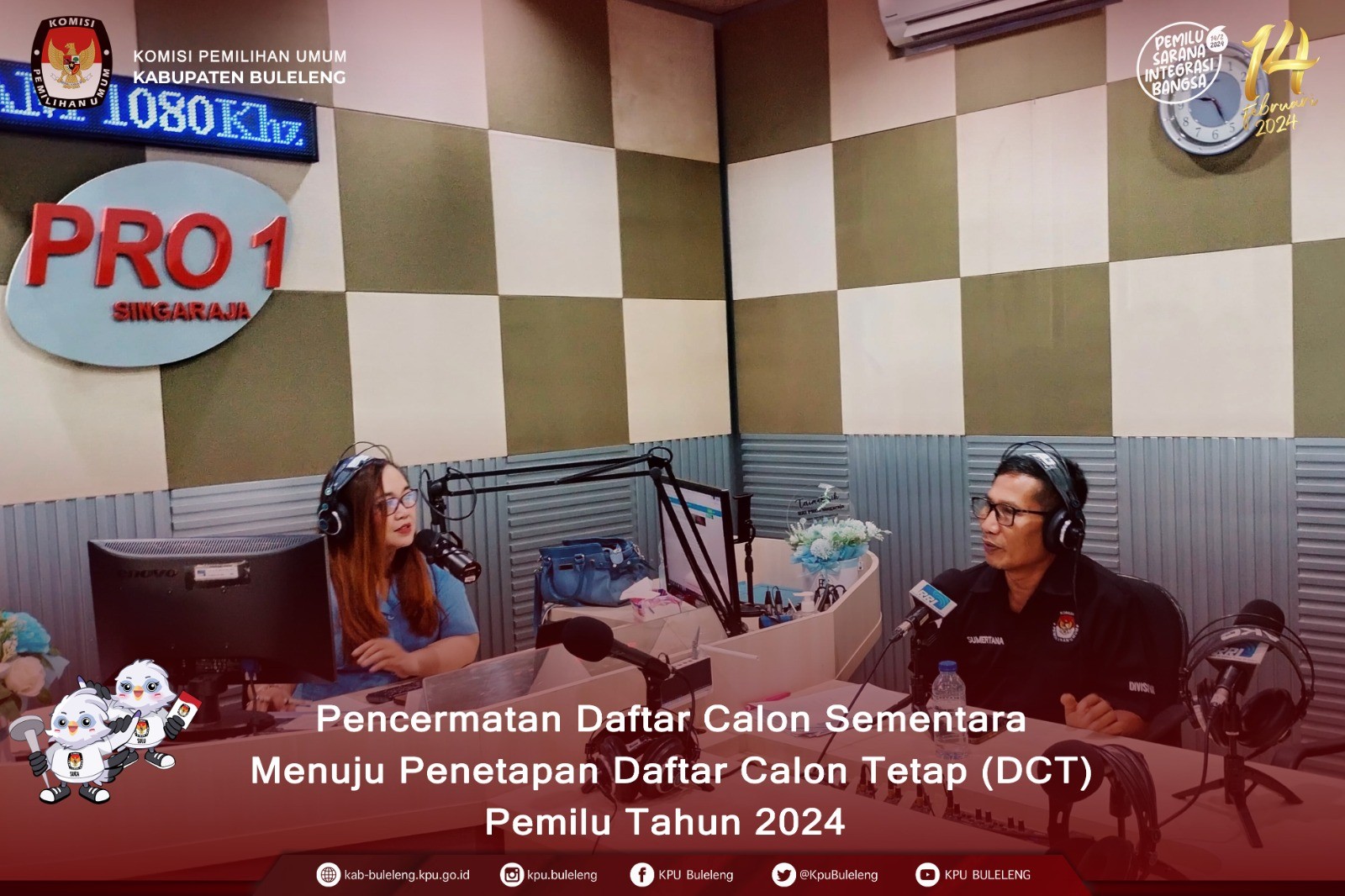 Singaraja, kab-buleleng.kpu.go.id - Divisi Hukum dan Pengawasan KPU Kabupaten Buleleng Made Sumertana.S.H. hadir sebagai narasumber di Hai Bali Kenken “Tahapan Pencermatan Daftar Calon Sementara Menuju Penetapan Daftar Calon Tetap (DCT) Pemilu Tahun 2024” di Pro1 RRI Singaraja, Rabu (04/10/2023) Dalam acara yang di pandu oleh Irma tersebut, Made Sumertana menjelaskan bahwa proses tahapan pencalonan sangatlah panjang, dari pengajuan bakal calon di masing-masing partai politik, kemudian dilajutkan dengan proses tahapan verifikasi administrasi dokumen bakal calon, lalu pengajuan perbaikan dan pencermatan rancangan DCS yang berkahir pada Selasa, (3/10/2023) malam PK. 23.59 WITA, hingga jadwal ditetapkannya DCT pada tanggal 4 November 2023. Dalam kesempatan tersebut, Made Sumertana juga mengucapakan terima kasih kepada Partai Politik yang sudah sangat responsif saat pengajuan rancangan DCT sehingga tahapan tersebut berjalan dengan lancar. Pada closing statement, Made Sumertana mengajak kepada seluruh masyarakat Buleleng untuk tetap menjaga kondisi Buleleng tetap kondusif, dan jangan lupa datang ke TPS pada tanggal hari pemungutan suara Pemilu Tahun 2024, Rabu 14 Februari 2024. (kobe.red/Foto KPU Buleleng/hupmas)