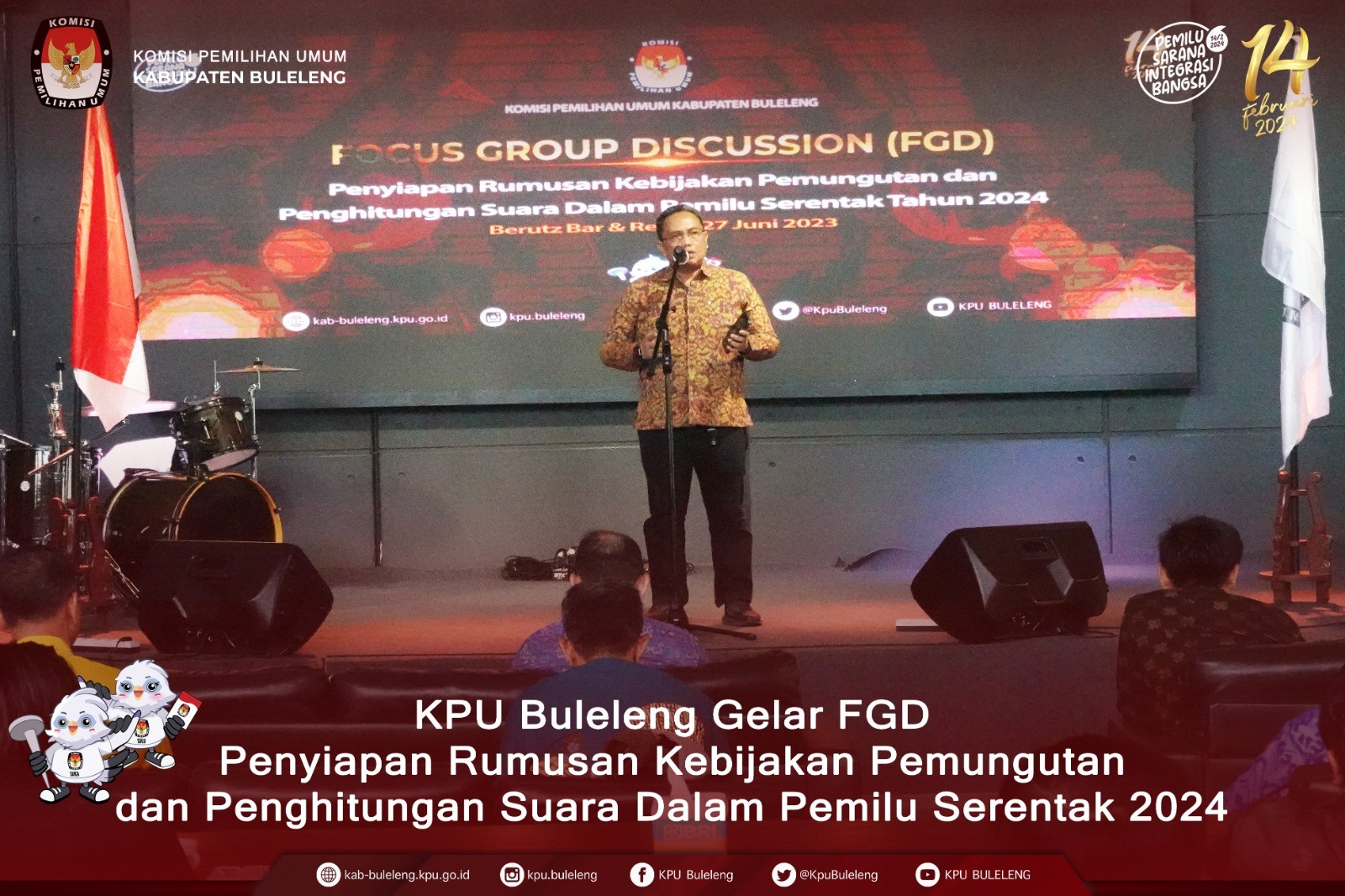 Singaraja, Kab-buleleng.kpu.go.id – Sesuai dengan Surat KPU RI Nomor 636/PL.01.8-SD/08/2023, KPU Kabupaten Buleleng melaksanakan kegiatan Focus Group Discussion (FGD) Penyiapan Rumusan Kebijakan Pemungutan dan Penghitungan Suara dalam Pemilu Serentak Tahun 2024 di Berutz Bar & Resto, Pemaron, Selasa (27/6/2023). Kegiatan yang digelar dalam rangka penyusunan rancangan Peraturan KPU tentang Pemungutan dan Penghitungan Suara dalam Pemilu Tahun 2024 ini dibuka oleh Ketua KPU Kabupaten Buleleng, Komang Dudhi Udiyana, dihadiri oleh undangan dari instansi terkait, akademisi/pemerhati pemilu dari perguruan tinggi di Kabupaten Buleleng, tokoh agama, organisasi kepemudaan/keagaamaan, Ketua Partai Politik Peserta Pemilu Tahun 2024 serta Ketua PPK se-Kabupaten Buleleng dengan mengajak satu anggotanya. Pada kesempatan tersebut, Divisi Teknis Penyelenggara Pemilu KPU Kabupaten Buleleng Gede Sutrawan menyampaikan isu strategis Rancangan Peraturan KPU tentang Pemungutan dan Penghitungan Suara Pemilu serentak Tahun 2024, diantaranya terkait metode penghitungan suara, penyiapan berita acara dan sertifikat hasil penghitungan suara kepada para pihak, penggandaan penyerahan Model C Hasil Rekapitulasi, pencoblosan yang sah, dan isu-isu lainnya. Acara dilanjutkan dengan diskusi dan penyampaian tanggapan serta masukan dari peserta yang nantinya akan di catat dan disampaikan kepada KPU RI sebagai bahan penyususnan Peraturan Pemungutan dan Penghitungan Suara Pemilu Serentak 2024 yang lebih sempurna. (Ikke/Foto KPU Buleleng/Kobe/Hupmas)