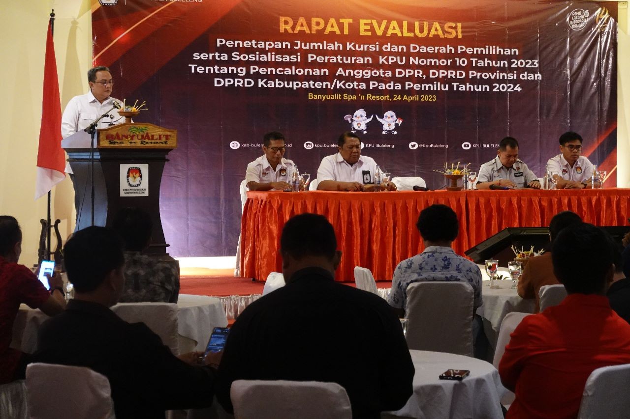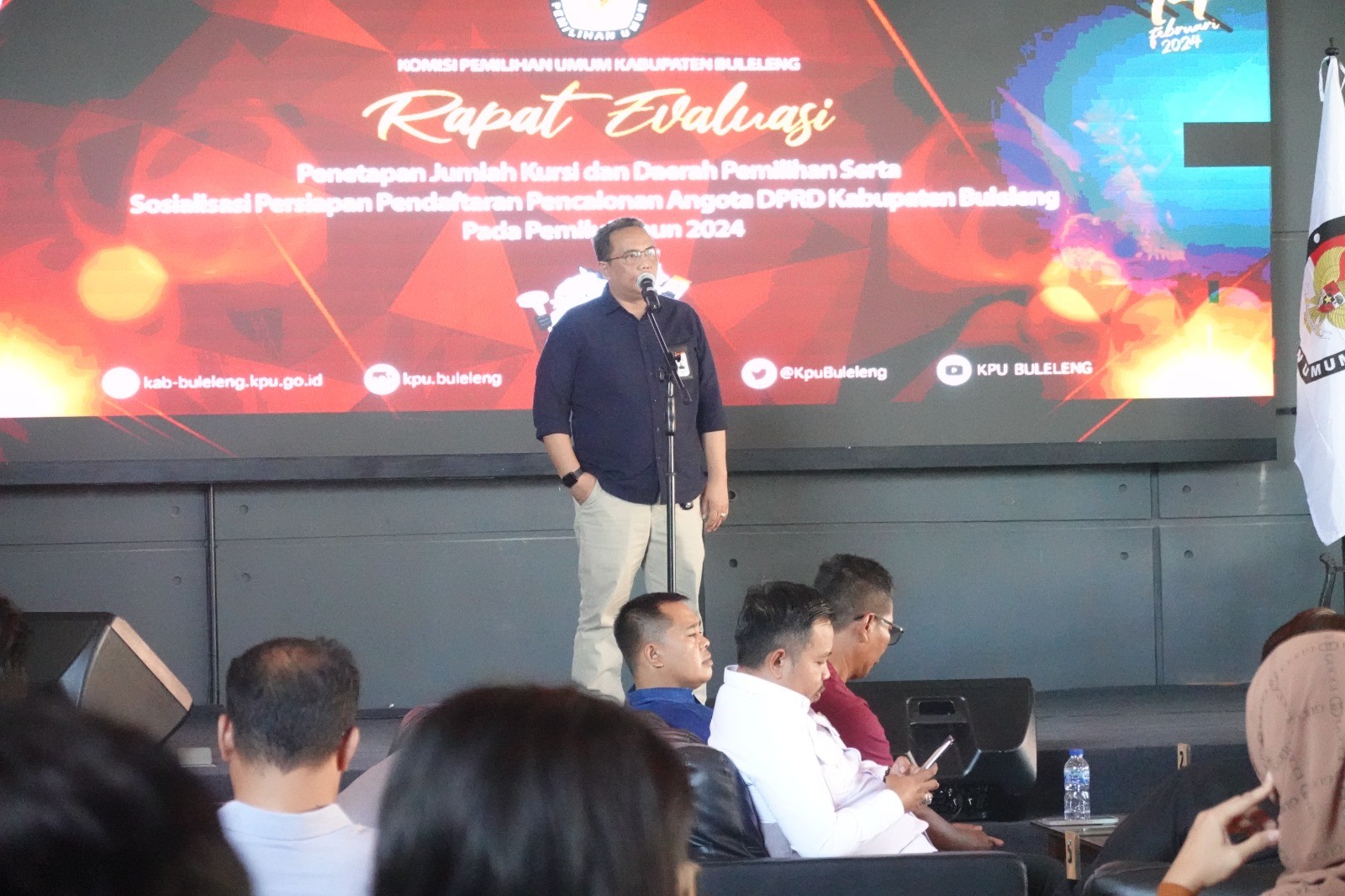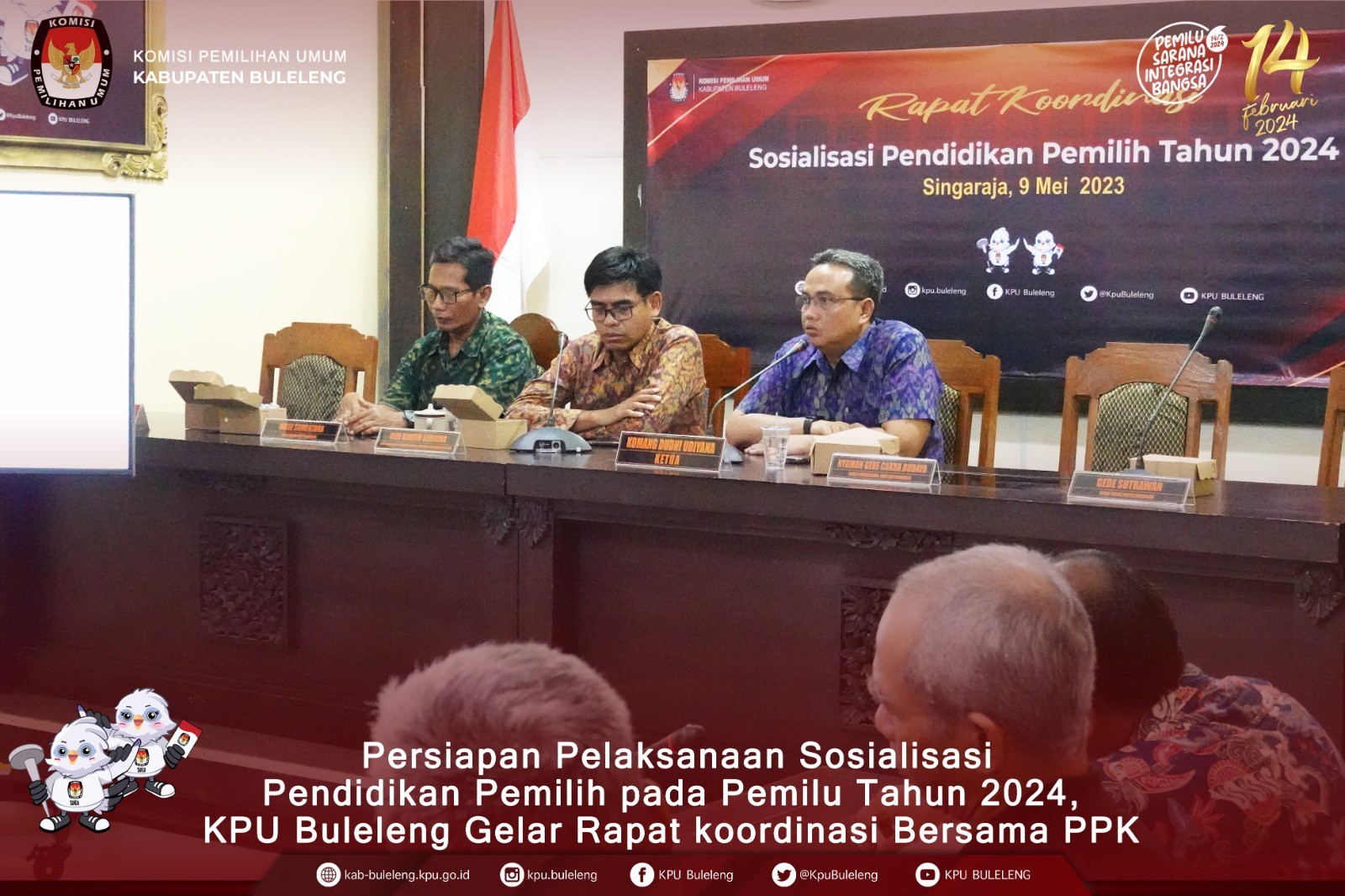 Singaraja, Kab-buleleng.kpu.go.id - Dalam rangka persiapan kegiatan sosialisasi dan pendidikan pemilih pada Pemilu Serentak Tahun 2024, KPU Kabupaten Buleleng melaksanakan rapat koordinasi dengan Ketua dan satu Anggota PPK se-Kabupaten Buleleng, di Ruang Rapat Kantor KPU Kabupaten Buleleng, Selasa (9/5/2023). Rapat dibuka oleh Ketua KPU Kabupaten Buleleng, Komang Dudhi Udiyana, yang dalam sambutannya menyampaikan bahwa kegiatan sosialisasi Pemilu 2024 akan mulai digulirkan, dengan menyasar masyarakat secara langsung melalui PPS. Dengan keterbatasan anggaran, dipersilahkan kepada PPK dan PPS untuk menyesuaikan. Pada kesempatan tersebut, Divisi Sosialisasi Pendidikan Pemilih, Partisipasi Masyarakat dan SDM Gede Bandem Samudra menyampaikan bahwa sosialisasi dilaksanakan bertujuan untuk menyampaikan informasi terkait pelaksanaan Pemilu Tahun 2024 dan memberikan pendidikan pemilih kepada masyarakat untuk menjadi pemilih yang cerdas. Ketentuan sosialisasi kali ini adalah dilakukan dengan metode tatap muka oleh PPS dan PPK dengan target pelaksanaan satu kali dalam satu bulan. Karena keterbatasan anggaran, PPK dan PPS diijinkan untuk melakukan sosialisasi pada kegiatan-kegiatan yang dilakukan masyarakat yang sifatnya mengumpulkan masyarakat seperti paruman desa, arisan, dan lain sebagainya dengan meminta ijin terlebih dahulu sebelumnya. Bandem Samudra menyampaikan bahwa dalam sosialisasi, ada informasi dasar yang harus disampaikan kepada masyarakat, antara lain tentang hari dan tanggal pemungutan suara yaitu pada Rabu, 14 Februari 2024, proses atau tahapan Pemilu 2024 yang sedang berjalan, pelaksana pemilu, peserta pemilu dan lain sebagainya. Diakhir acara, Dudhi Udiyana menyampaikan agar PPK segera menindaklanjuti hasil rapat ini dengan melakukan koordinasi bersama PPS diwilayah masing-masing kemudian segera merencanakan dan melakukan kegiatan sosialisasi. (Ikke/Foto KPU Buleleng/Kobe/Hupmas)