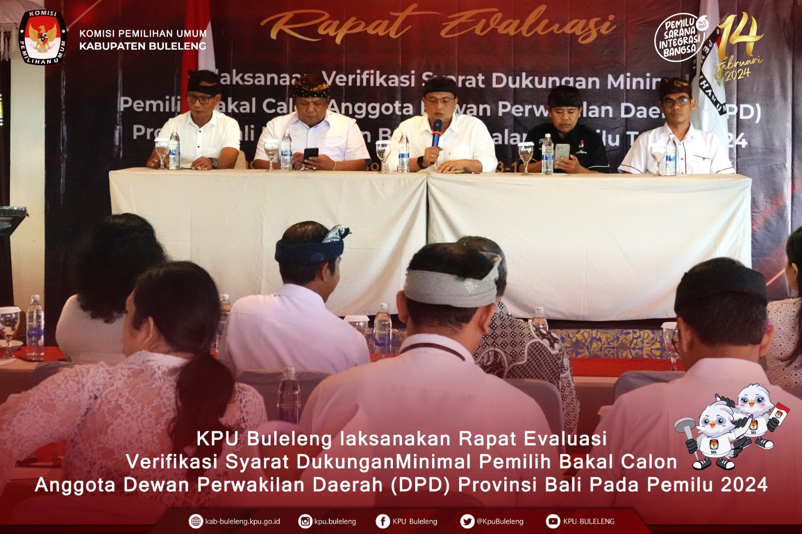 Singaraja, Kab-buleleng.kpu.go.id - Komisi Pemilihan Umum (KPU) Kabupaten Buleleng melaksanakan kegiatan Rapat Evaluasi Pelaksanaan Verifikasi Syarat Dukungan Minimal Pemilih Bakal Calon Anggota Dewan Perwakilan Daerah (DPD) Provinsi Bali di Kabupaten Buleleng Dalam Pemilu Tahun 2024, Kamis hingga Jumat, 13 – 14 April 2023 bertempat di Bali Handara Golf & Resort, Desa Pancasari Kecamatan Sukasada Kabupaten Buleleng.