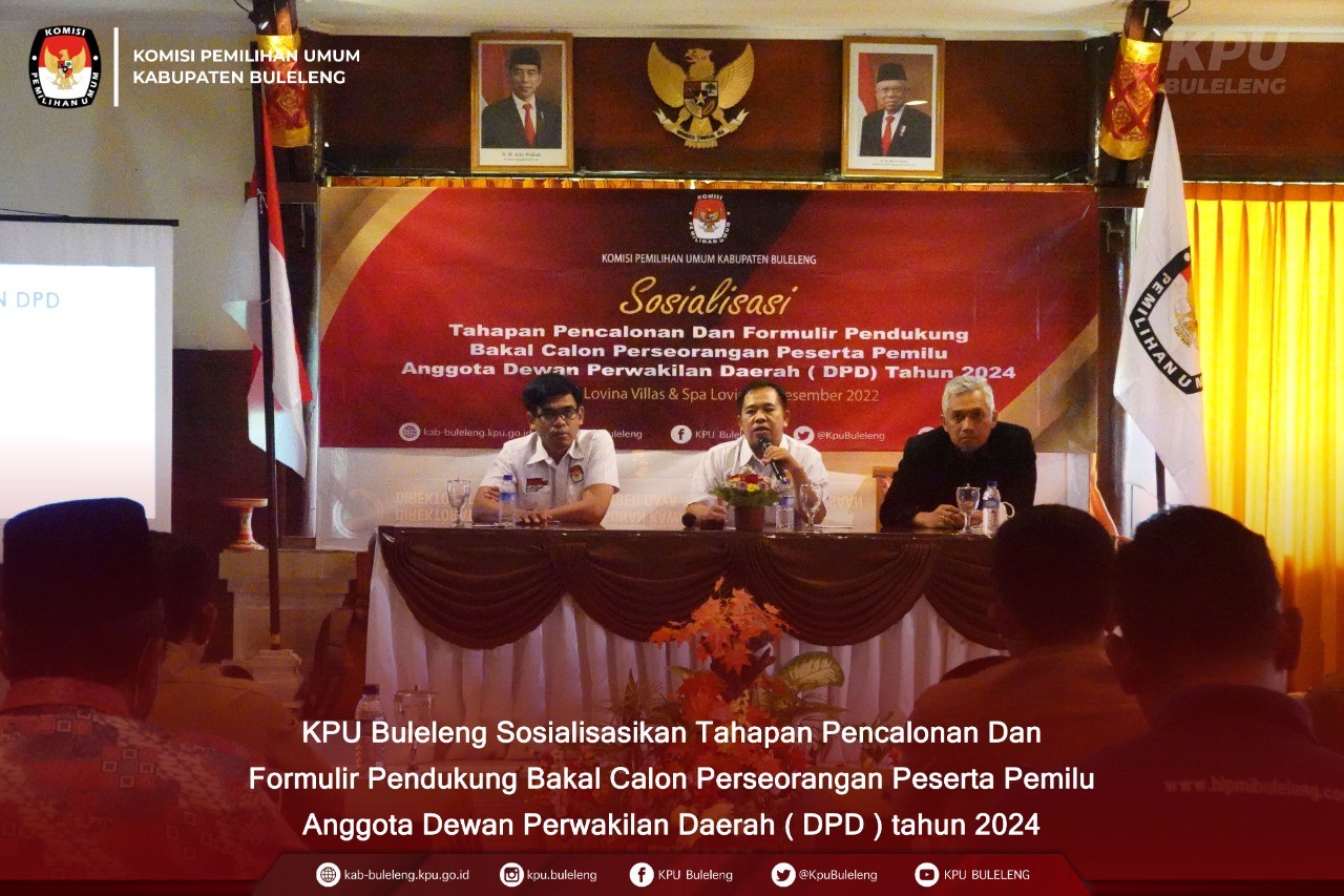 Singaraja, kab-buleleng.kpu.go.id –Komisi Pemilihan Umum (KPU) Kabupaten Buleleng melaksanakan acara Sosialisasi Pencalonan dan Formulir Pendukung Bakal Calon Perseorangan Peserta Pemilu Anggota DPD Tahun 2024 di Hotel Aneka, Lovina, Senin (5/12/2022). Acara yang dibuka oleh Ketua KPU Kabupaten Buleleng, Komang Dudhi Udiyana tersebut dihadiri oleh undangan dari instansi terkait di Pemerintah Kabupaten Buleleng seperti Badan Kesbangpol Kabupaten Buleleng, Dinas PMD Kabupaten Buleleng, Dinas Dukcapil Kabupaten Buleleng dan Dinas Kominfosanti Kabupaten Buleleng, Bawaslu Kabupaten Buleleng, Rektor/Akademisi Pemerhati Pemilu, Tokoh Agama, Camat se-Kabupaten Buleleng serta organisasi kepemudaan di Buleleng. Hadir sebagai narasumber adalah akademisi dari Universitas Maha Saraswati Denpasar yang juga merupakan mantan Ketua KPU Provinsi Bali, Ketut Sukawati Lanang Putra Perbawa. Lanang Perbawa memaparkan perihal bagaimana mendorong partisipasi serta pentingnya peran DPD untuk pembangunan di Kabupaten Buleleng menyampaikan bahwa sejarah lahirnya DPD adalah karena tuntutan demokratisasi pengisian anggota lembaga agar selalu mengikutsertakan rakyat pemilih, karena adanya tuntutan penyelenggaraan otonomi daerah yang jika tidak dikendalikan dengan baik akan berujung pada tuntutan separatisme serta sebagai upaya lain untuk menjaga integrasi nasional. Pada sesi tanya jawab, terdapat pertanyaan dari Ketua KNPI Buleleng, Gede Parma yang menanyakan bagaimana cara menarik pemilih pemula dan meningkatkan partisipasi masyarakat ditengah ketidakpercayaan masyarakat terhadap pemilu. Lanang Perbawa kemudian menanggapi bahwa ada tiga perilaku pemilih pada saat pemilu, yaitu pemilih tradisional, memilih karena klien dan pemilih rasional. Dalam hal ini, pemilih rasional yang menggunakan ideologi dan melihat track record calon pemimpin itu yang harus dimaksimalkan. “Caranya adalah semua stakeholder harus mau memberikan pemahaman yang banyak kepada masyarakat sehingga akan melahirkan pemilih yang rasional,”ungkapnya. Karena pemimpin lahir dari refleksi masyarakat pemilihnya. Jika masyarakat memilih calon pemimpin secara rasional, maka pemilu akan menghasilkan pemimpin yang baik dan mampu melahirkan kebijakan-kebijakan yang berpihak pada rakyat. Selain Lanang Perbawa, juga hadir sebagai narasumber yaitu Anggota KPU Kabupaten Buleleng Divisi Sosialisasi Pendidikan Pemilih, Partisipasi Masyarakat dan SDM Gede Bandem Samudra didampingi Divisi Teknis Penyelenggara Pemilu, Gede Sutrawan yang menyampaikan Tahapan Pencalonan dan Formulir Pendukung Bakal Calon Perseorangan Peserta Pemilu Anggota DPD Tahun 2024. (Ikke.Red/Foto KPU Buleleng/Kobe/hupmas)
