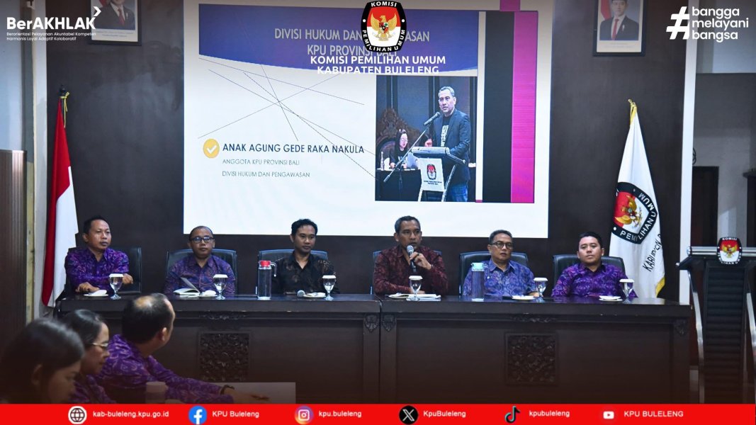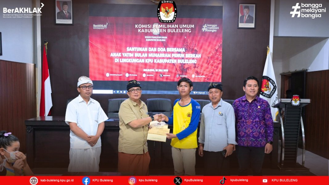 Singaraja, kab.buleleng.go.id – Dilaksanakan secara serentak oleh Komisi Pemilihan Umum se-Indonesia, Komisi Pemilihan Umum (KPU) Kabupaten Buleleng melaksanakan santunan anak yatim di lingkungan KPU dalam rangka bentuk kepedulian Komisi Pemilihan Umum terhadap generasi bangsa dan mempererat silaturahmi serta meningkatkan solidaritas antar sesama, bertempat di ruang Rapat KPU Kabupaten Buleleng, pada Hari Jumat, (25/7/2025) Pelaksanaan kegiatan santunan anak yatim yang dilaksanakan bertepatan dengan Bulan Muharram Penuh Berkah menunjuk Panti Asuhan Ganesha Sevanam yang beralamat di Desa Jagaraga sebagai peneriman santunan. Acara ini dipimpin langsung oleh Ketua KPU Kabupaten Buleleng Komang Dudhi Udiyana yang dalam sambutannya menyampaikan kegiatan ini bentuk kepedulian KPU dengan sesama, agar santunan dapat diterima, dipergunakan dan di manfaatkan dengan baik dalam mengisi kegiatan yang di laksanakan oleh panti asuhan. Besar harapan para generasi penerus selalu dalam keadaan sehat, tidak henti dalam menimba ilmu serta tetap melanjutkan sekolah, agar berguna untuk Bangsa dan Negara. Dilanjutkan dengan doa Bersama yang dipimpin oleh Putu Arya Suarnata, Anggota KPU Divisi Sosialisasi Pendidikan Pemilih, Partisipasi Masyarakat dan SDM. Doa Bersama menghantarkan kita agar selalu dalam keadaan sehat dan selalu diberikan kelancaran dalam melaksanakan tugas. Pada akhir acara perwakilan dari Panti Asuhan Ganesha Sevanam Kadek Agus Setiawan mengucapkan terima kasih kepada KPU karena sudah berkenan berbagi kepada kami Panti Asuhan Ganesha Sevanam. Kegiatan ditutup dengan foto bersama. (Parhumas/KPU Buleleng)