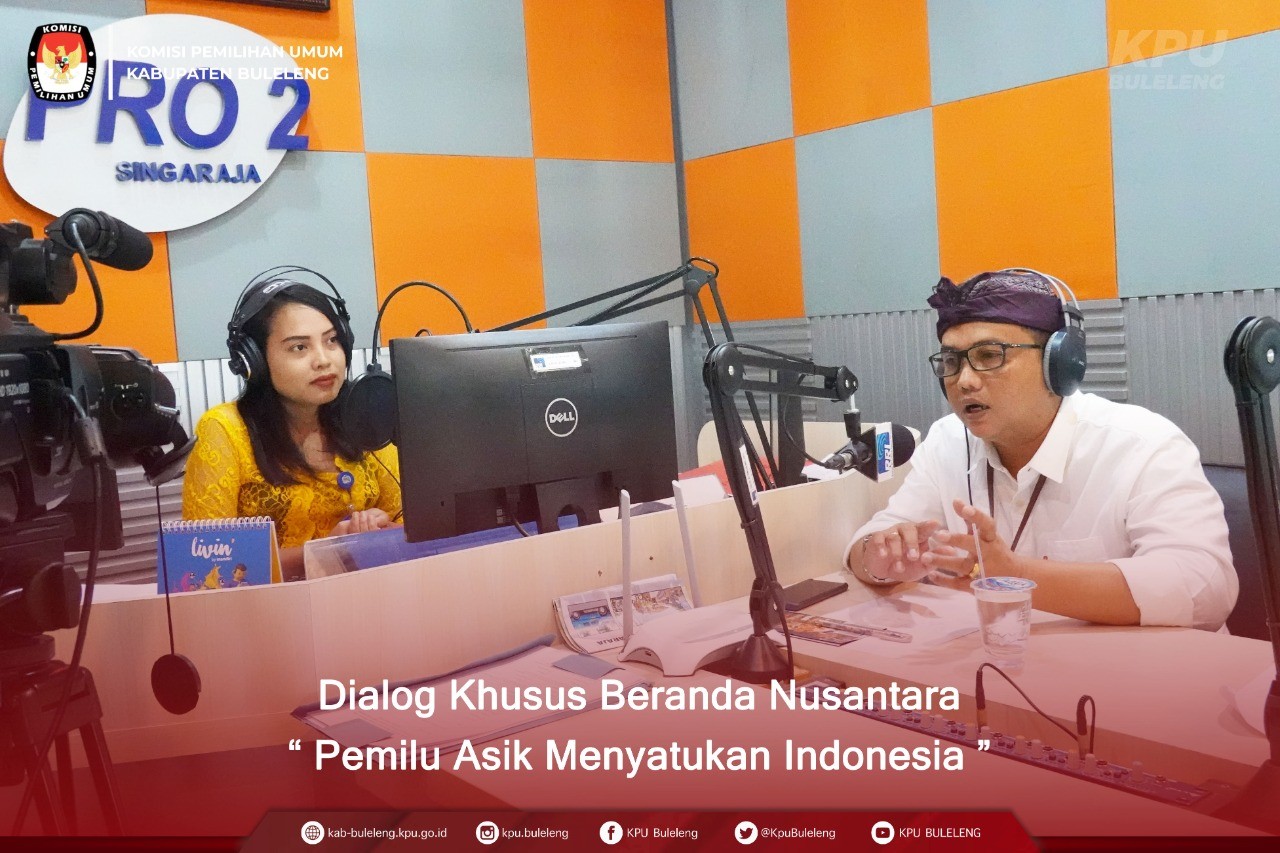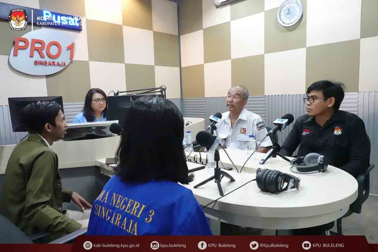 Singaraja, kab-buleleng.kpu.go.id – Anggota Komisi Pemilihan Umum Kabupaten Buleleng Divisi Sosialisasi Pendidikan Pemilih Partisipasi Masyarakat dan SDM Gede Bandem Samudra bersama Ketua Bawaslu Kabupaten Buleleng Putu Sugi Ardana, Ketua HMI Cabang Buleleng Agung Ardiansyah dan Sekretaris Osis SMA Negeri 3 Singaraja Komang Ayu Trisna Dewi hadir sebagai Narasumber dalam Dialog Khusus Beranda Nusantara “Pemilu Asik Menyatukan Indonesia” di RRI Singaraja Rabu 27/07/2022.