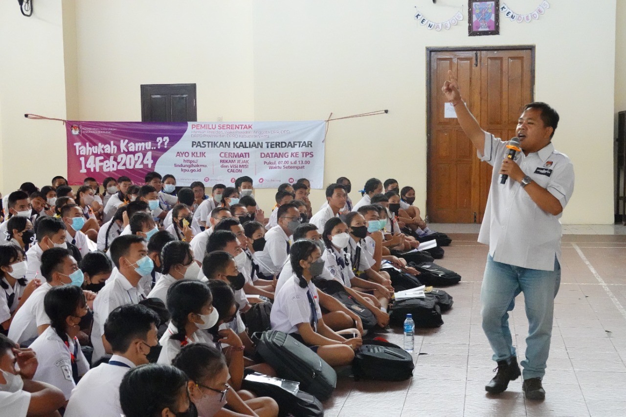 Singaraja, kab-buleleng.kpu.go.id – Program sosialisasi pendidikan pemilih yang dilaksanakan Komisi Pemilihan Umum (KPU) Kabupaten Buleleng dalam bentuk “KPU Goes to School” pada minggu ini menyasar siswa/siswi peserta Masa Pengenalan Lingkungan Sekolah (MPLS) Tahun 2022 di Kabupaten Buleleng. Salah satu sekolah yang didatangi kali ini adalah SMA Negeri 4 Singaraja, Senin (11/7/2022). Hadir sebagai narsumber adalah Anggota KPU Kabupaten Buleleng Divisi Teknis Penyelenggara, Gede Sutrawan. Pada kesempatan tersebut, Gede Sutrawan menyampaikan materi tentang pengertian pemilu, peserta pemilu, syarat memilih, pelaksanaan Pemilu Tahun 2024 dan informasi lainnya yang dikemas dengan ringan sehingga mudah dipahami oleh siswa/siswi peserta sosialisasi yang notabene adalah calon pemilih pemula. Metode sosialisasi yang digunakan adalah komunikasi dua arah yang diselingi dengan contoh-contoh menarik. Pada intinya, Sutrawan mengajak siswa/siswi peserta sosialisasi untuk belajar menentukan pilihan. “Pada saat pemilu, kita diajarkan untuk memilih calon pemimpin secara langsung, umum, bebas dan rahasia dengan mencoblos di TPS. Diantara semua pilihan, akan ada yang baik dan yang buruk. Disitulah tugas kita untuk bisa menjadi pemilih yang cerdas yang mampu memilih calon pemimpin yang baik,” ungkapnya. Cara mengetahui calon tersebut baik atau buruk adalah dengan melihat rekam jejaknya serta program-program yang ditawarkan pada masa kampanye, jelasnya. Disela-sela penyampaiannya, Sutrawan membagi-bagikan coklat kepada siswa yang aktif dalam bertanya atau menjawab pertanyaan dari narasumber. Sosialisasi yang berlangsung selama 30 menit tersebut diakhiri dengan foto bersama dan pengucapan yel-yel “Pemilu 2024 Sukses”. (ikke.red/Foto KPU Buleleng/hupmas)