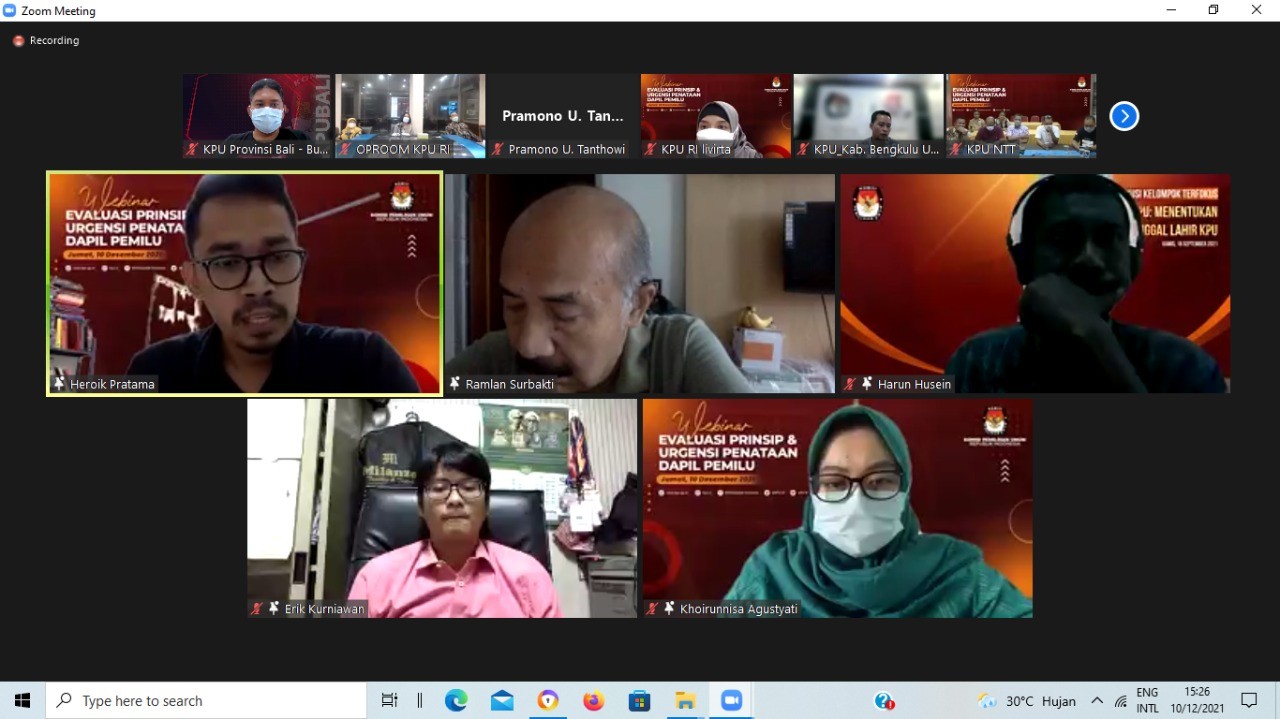 Perubahan alokasi kursi yang terjadi pada suatu daerah pemilihan (Dapil) dianggap sebagai sesuatu yang wajar terjadi mengingat alokasi kursi bergantung pada jumlah penduduk yang notabene selalu berubah atau bergeser. Proses pembentukan Dapil di tiap negara sampai terbentuk angka ideal antara jumlah Dapil dan jumlah anggota DPR/DPRD merupakan implementasi dari keterwakilan daerah maupun keterwakilan ragam suku budaya. Demikian terungkap dalam webinar yang bertajuk Evaluasi Prinsip dan Urgenitas Penataan Dapil Pemilu yang diselenggarakan KPU RI secara daring, Jumat (10/12/2021). Webinar ini dibuka oleh Anggota KPU RI, Pramono Umbaid, menghadirkan empat narasumber yang telah lama berkecimpung dalam dunia kepemiluan, yakni Prof. Ramlan Surbakti, Harun Husein, Erik Kurniawan dan Khoirunnisa Nur Agustyati. Sebagai peserta adalah Anggota Divisi Teknis Penyelenggaraan dari KPU Provinsi dan KPU Kabupaten/Kota. Dalam sambutanya, Anggota KPU RI Pramono Umbaid mewakili Ketua, menyampaikan bahwa penentuan dapil merupakan bagian terpenting dalam pemilu dimana para calon sangat berkontestasi menyusun strategi bagi partai dalam menentukan perolehan kursinya. Webinar yang berlangsung selama tiga jam ini membahas permasalahan dapil di berbagai daerah di Indonesia untuk dicarikan masukan dan solusi. (roe)