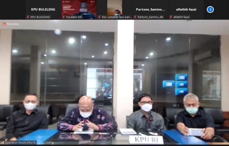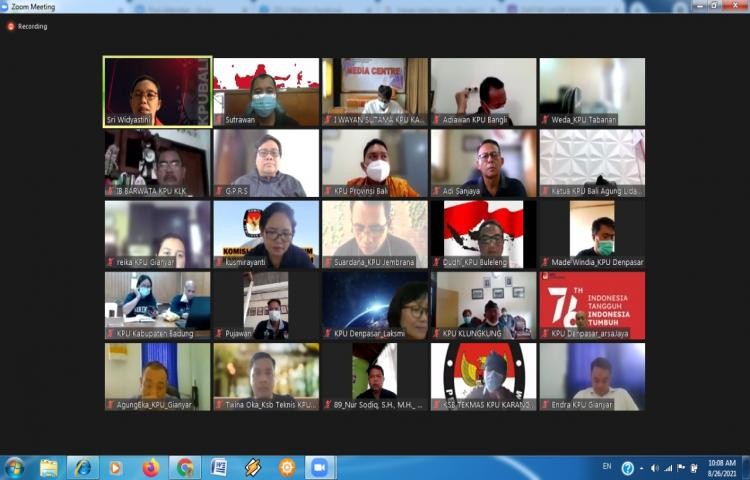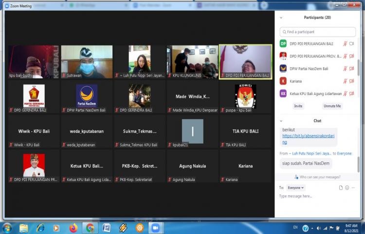 Komisioner KPU Kabupaten Buleleng menghadiri rapat kordinasi persiapan verifikasi partai politik peserta Pemilu Tahun 2024 yang digelar oleh KPU Provinsi Bali secara daring pada Kamis (26/8/2021). Peserta rakor adalah Ketua dan Anggota beserta Kasubag Teknis dari KPU Kabupaten/Kota se-Bali. Rapat dibuka oleh Ketua KPU Provinsi Bali, Dewa Gede Agung Lidartawan. Dalam sambutannya, Agung Lidartawan menyampaikan bahwa terkait Peraturan KPU tentang pendaftaran partai politik peserta Pemilu Tahun 2024 akan mengalami beberapa perubahan. Untuk itu perlu adanya sosialisasi lebih awal, guna mendapatkan masukan dari bawah. Sementara Anggota KPU Provinsi Bali Divisi Teknis Penyelenggara, Luh Putu Sri Widyastini menyampaikan tentang permasalahan dan kendala-kendala yang dihadapi pada tahapan verifikasi partai politik berdasarkan pengalaman pada Pemilu Tahun 2019 yang lalu. Berikutnya juga disampaikan solusi dari berbagai permasalahan yang ditemui. Selanjutnya dipersilahkan kepada KPU Kabupaten/Kota untuk memberikan masukan secara tertulis atas rancangan peraturan tentang pendaftaran parpol kepada KPU Provinsi Bali untuk kemudian diteruskan kepada KPU RI. (roe)