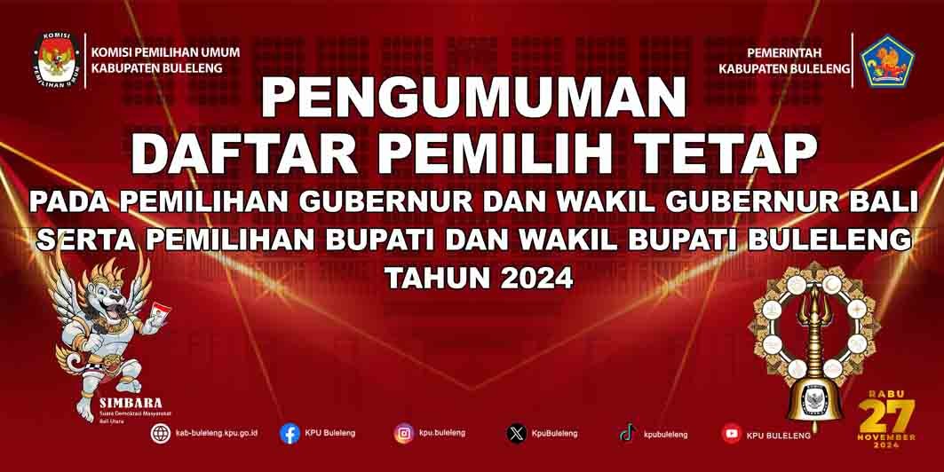 Sesuai dengan Peraturan Komisi Pemilihan Umum Nomor 10 Tahun 2024 tentang Perubahan atas Peraturan Komisi Pemilihan Umum Nomor 8 Tahun 2024 tentang Pencalonan Gubernur dan Wakil Gubernur, Bupati dan Wakil Bupati, serta Walikota dan Wakil Walikota serta berdasarkan Keputusan Komisi Pemilihan Umum Kabupaten Buleleng No. 1293 Tahun 204 tentang Penetapan Pasangan Calon Peserta Pemilihan Bupati dan Wakil Bupati Buleleng Tahun 2024, Komisi Pemilihan Umum Kabupaten Buleleng mengumumkan hasil Penetapan Pasangan Calon Peserta Pemilihan Bupati dan Wakil Bupati Buleleng Tahun 2024 untuk diketahui.