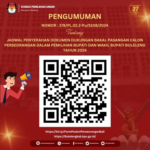 Dalam rangka pembentukan Calon Panitia Pemungutan Suara (PPS) untuk Pemilihan Gubernur dan Wakil Gubernur, Bupati dan Wakil Bupati Buleleng Tahun 2024, Komisi Pemilihan Umum Kabupaten Buleleng mengundang Warga Negara Indonesia yang memenuhi kualifikasi untuk mendaftarkan diri menjadi Panitia Pemungutan Suara untuk Pemilihan Gubernur dan Wakil Gubernur, Bupati dan Wakil Bupati Buleleng dengan ketentuan sebagai berikut :